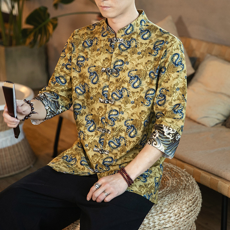2020 봄 여름 중국 스타일 세븐 포인트 슬리브 셔츠 세로 칼라 느슨한 플러스 사이즈 인쇄 복고풍 버튼 셔츠 트렌디 남성스토어 가기