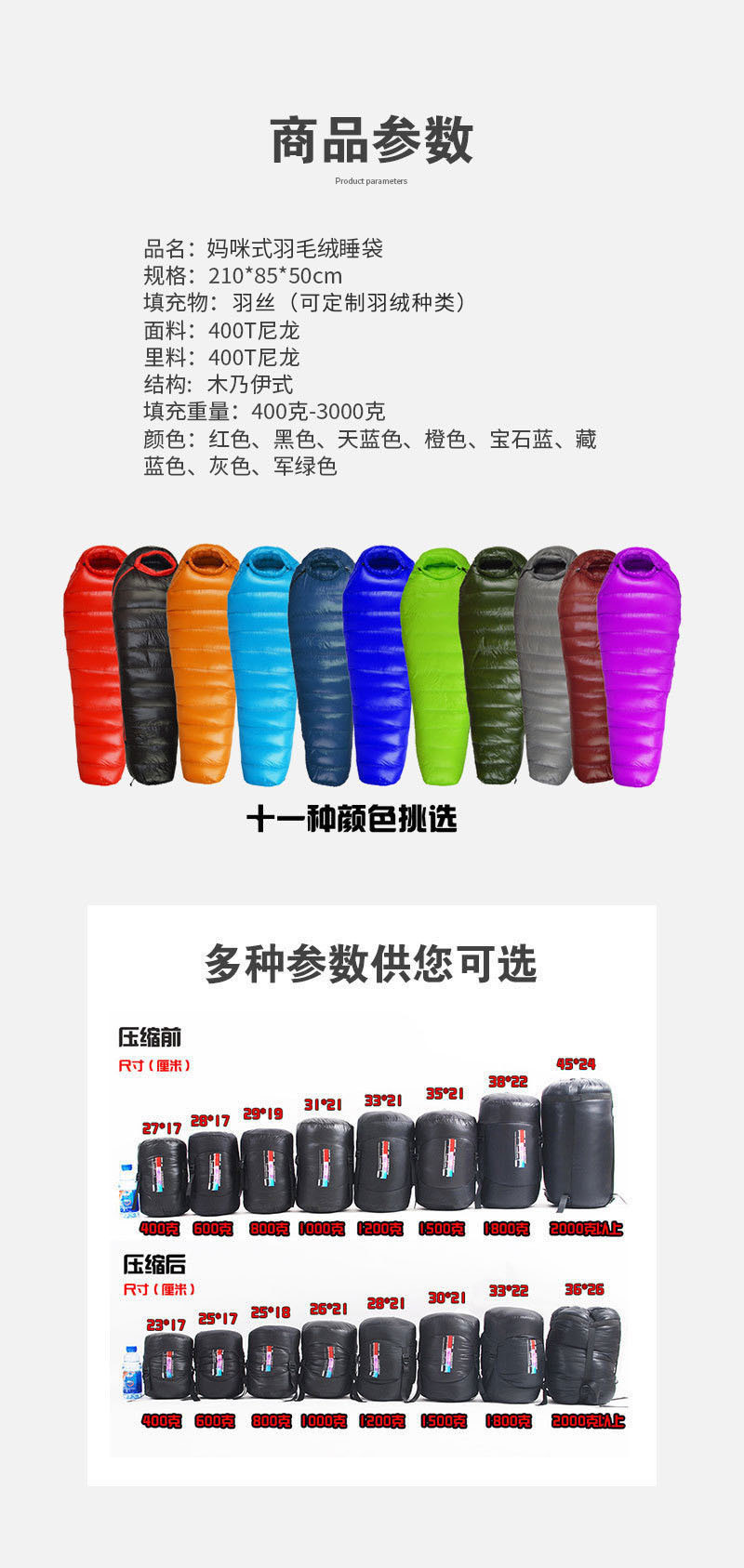 깃털 솜털 침낭 야외용 두꺼운 보온 맘미 스타일 캠핑 휴대용 캠핑 침낭 세탁 가능 제조업체 맞춤 제작스토어 가기