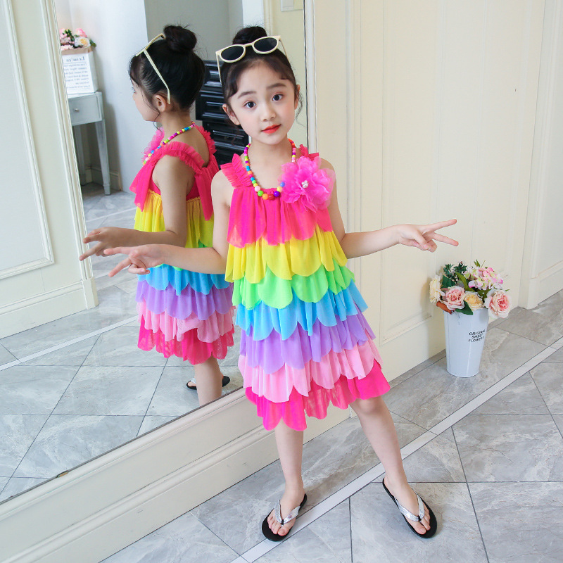 소녀의 무지개 원피스 여름 2023 새로운 어린이 슬링 케이크 스커트 여름을위한 소녀의 세련된 스커트