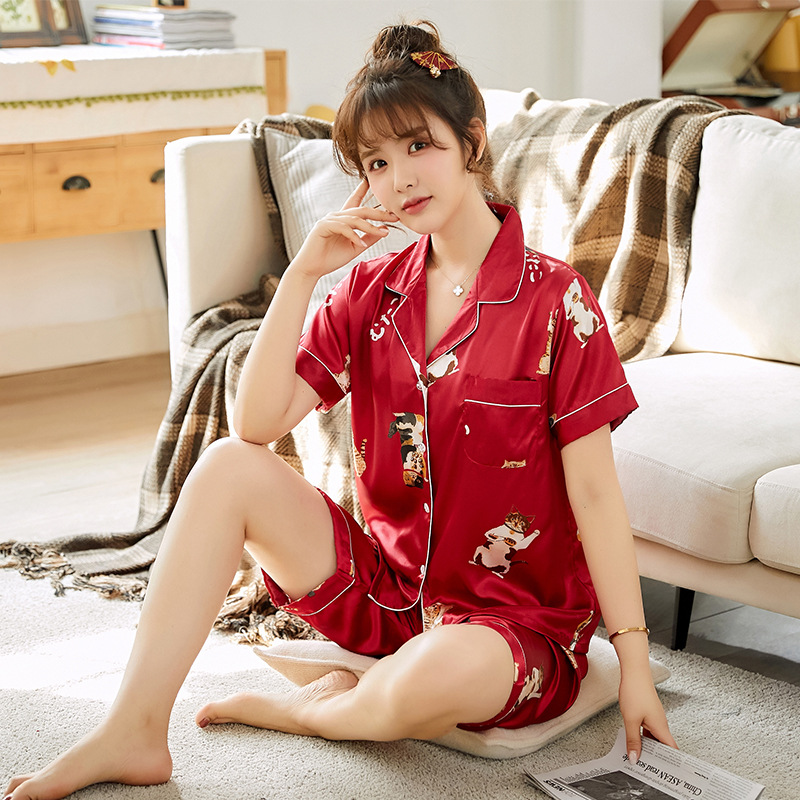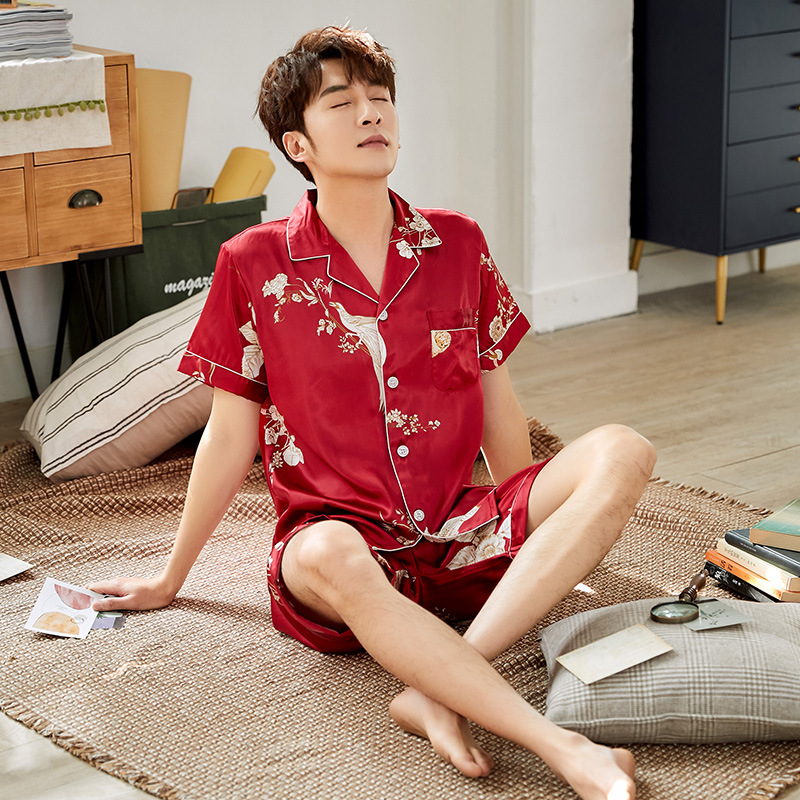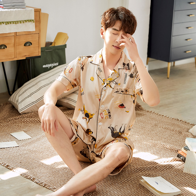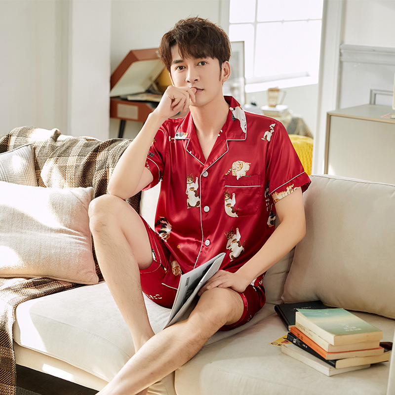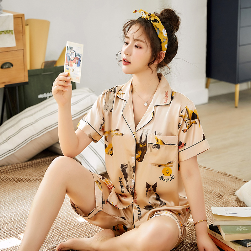 한 Yatong 커플 여름 잠옷 아이스 실크 반팔 반바지 남성과 여성의 가정복 시뮬레이션 실크 세트 신제품