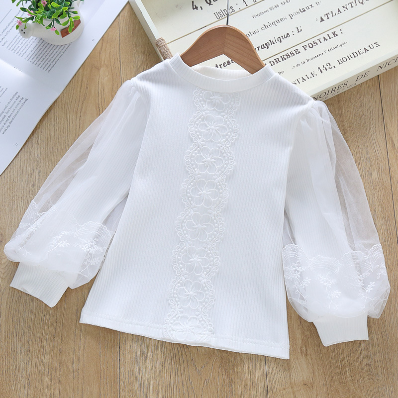 어린이 긴팔 티셔츠 봄과 가을 순면 흰색 소녀 세련된 퍼프 슬리브 탑 공주 내부 베이스 셔츠 얇은 7