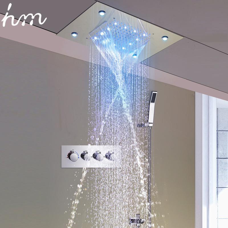 LED 스테인레스 스틸 은폐 된 상단 스프레이 다기능 샤워 헤드 세트 패션 일정한 온도 빛 비 샤워 헤드
