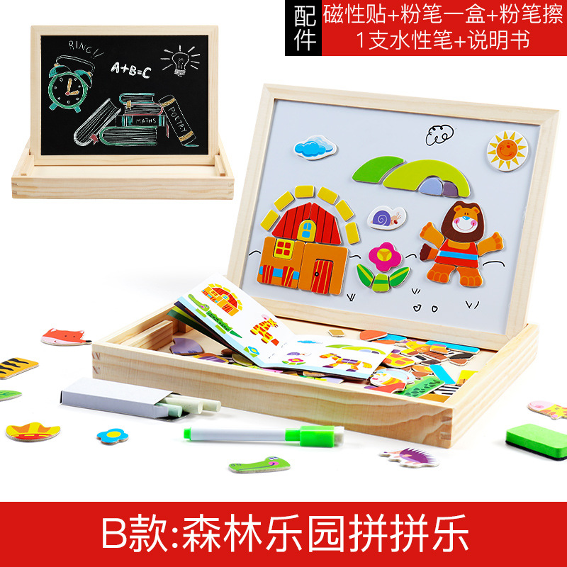 这是一款让孩子自由搭配与充分发挥想象力的玩具,百变换装,木盒本身就是一个收纳储存盒,精妙的设计使得磁性板能够非常简易地翻起并倾斜一定角度固定在盒子上。玩具能让孩子认识形状和颜色,培养孩子的空间思维能力,锻炼孩子的想象力,充分发挥孩子的创造力。家长可在一旁协助或亲子同玩,增进亲子之间的情感交流,磁性拼图由贴纸+木板+磁性材料构成,切勿水洗。