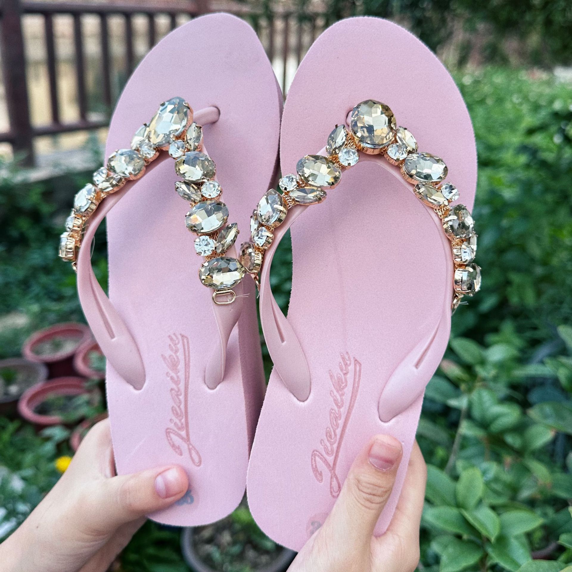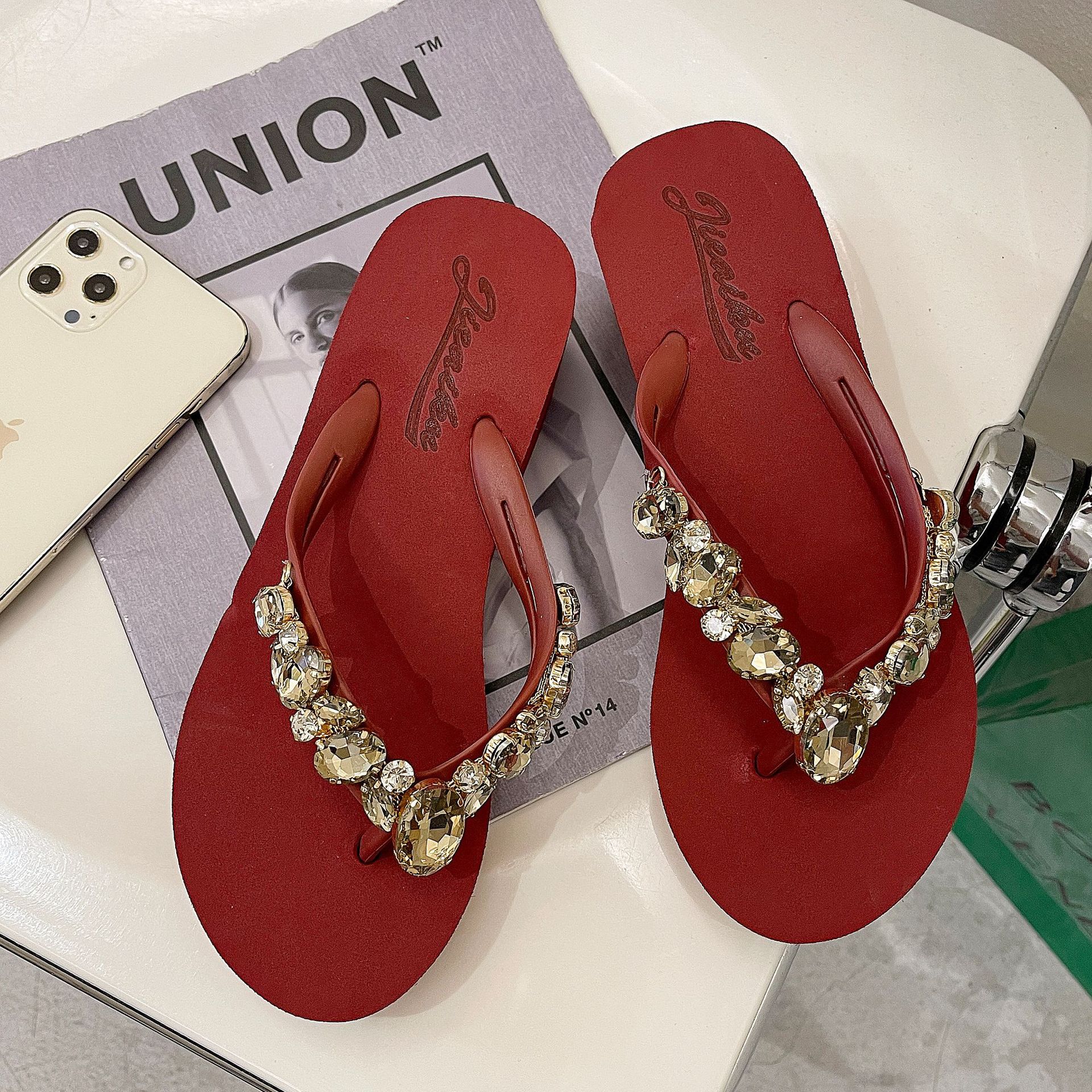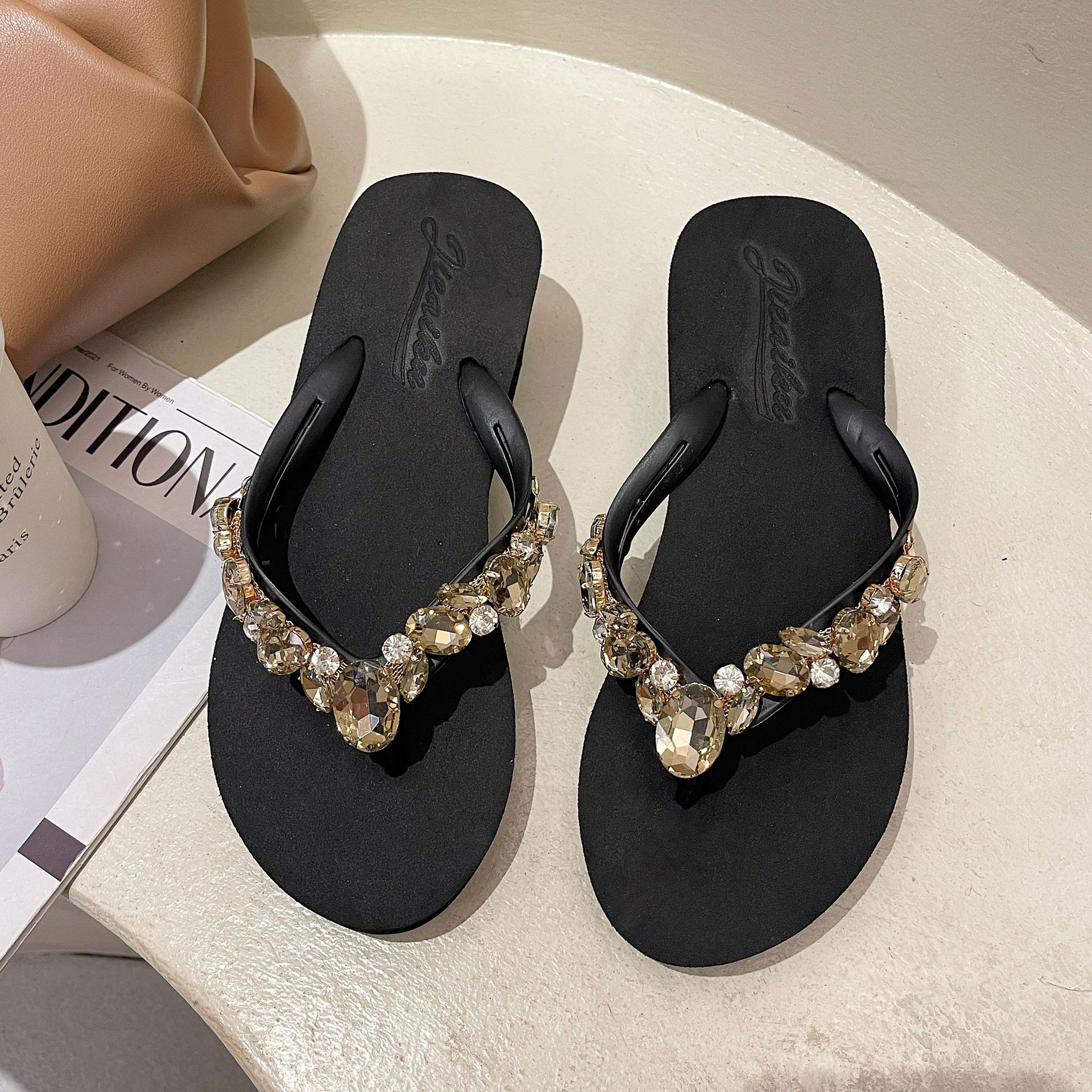 跨境新款女夏外穿时尚韩版女式凉鞋水钻海边沙滩百搭厚底人字拖鞋