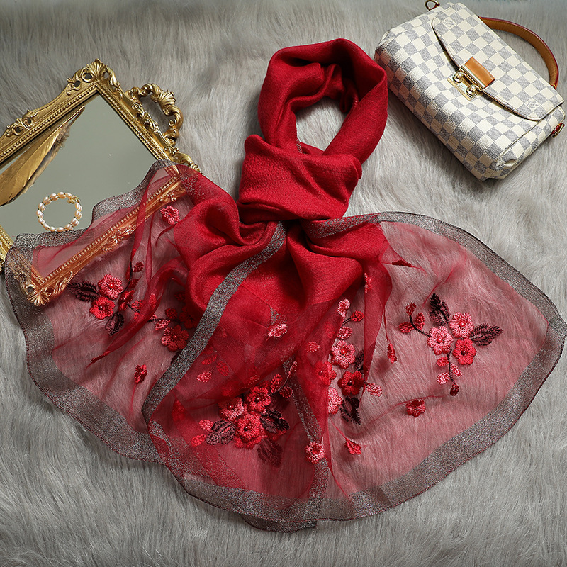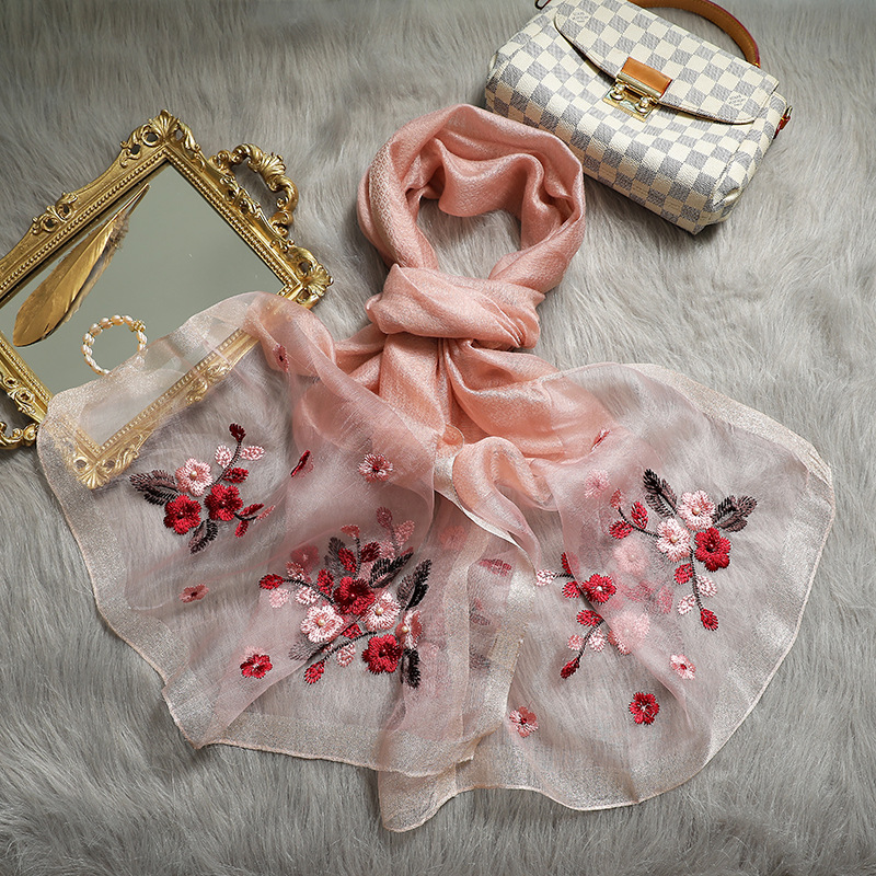 봄과 가을 자수 실크 스카프 다목적 패션 뽕나무 실크 울 한국 자수 자외선 차단제 그늘 스카프 여성