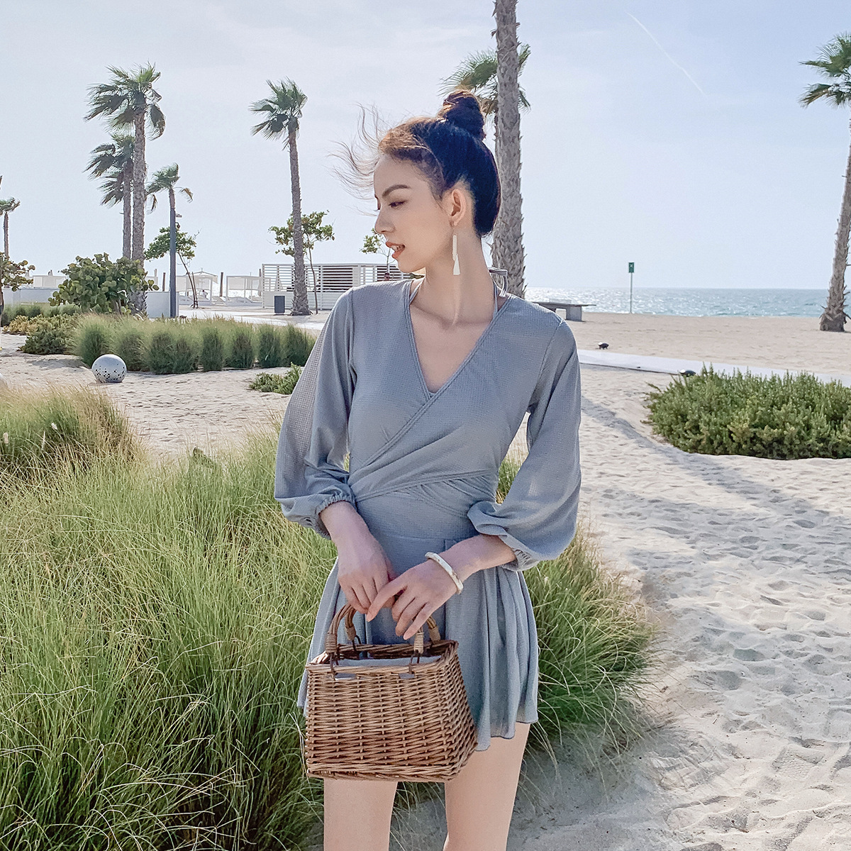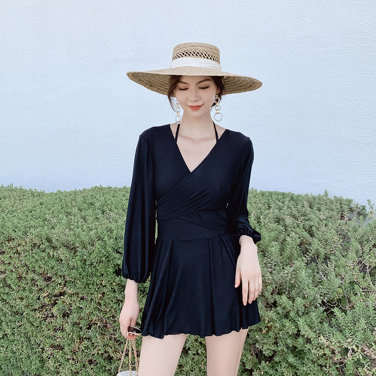긴팔 수영복 보온 자외선 차단 온천 레이스업 허리 타이트 우아한 어머니의 보수적 인 고기 덮음 슬리밍 쇼트 스커트스토어 가기