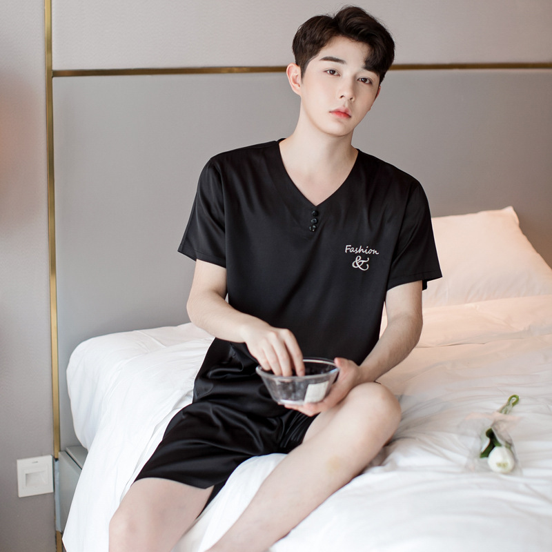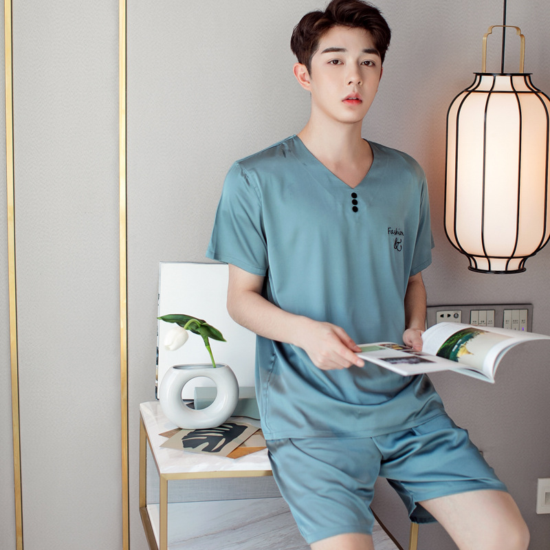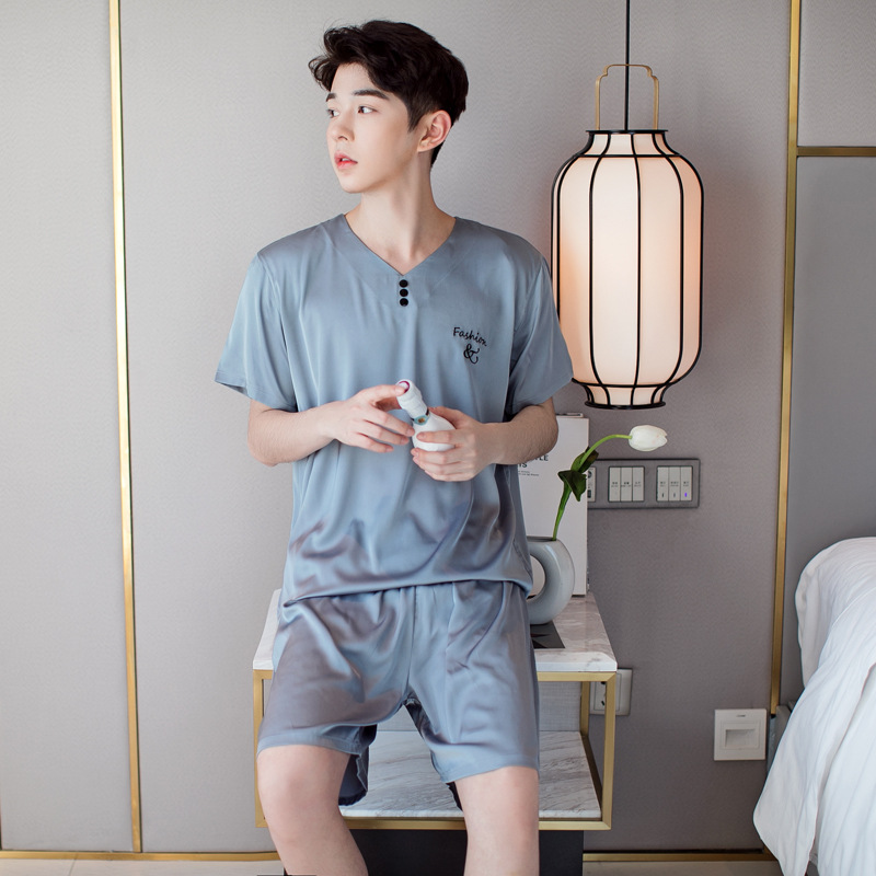 2023 새로운 여름 캐주얼 반팔 아이스 실크 심플 스타일 새틴 아이스 실크 풀오버 얇은 남성용 잠옷 가정복스토어 가기