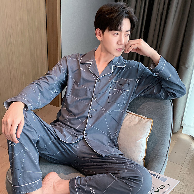 Jane Li Qi-다양한 L-3XL 봄과 가을 잠옷 남성용 긴 소매 카디건 홈 의류 2 피스 마이크로 비즈니스 폭발