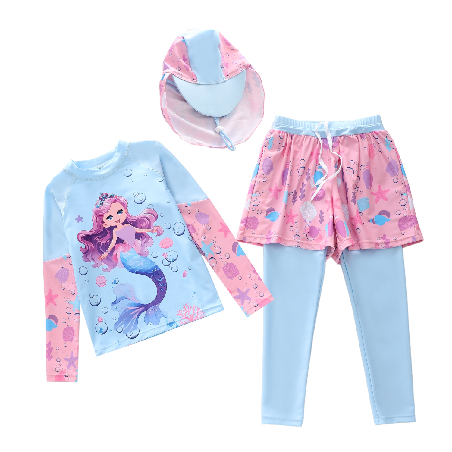 2024년 신상 아동 수영복 여아용 분리형 수영복 소형 중형 대형 어린이 인어 긴팔 긴바지 자외선 차단 모자 수영복스토어 가기