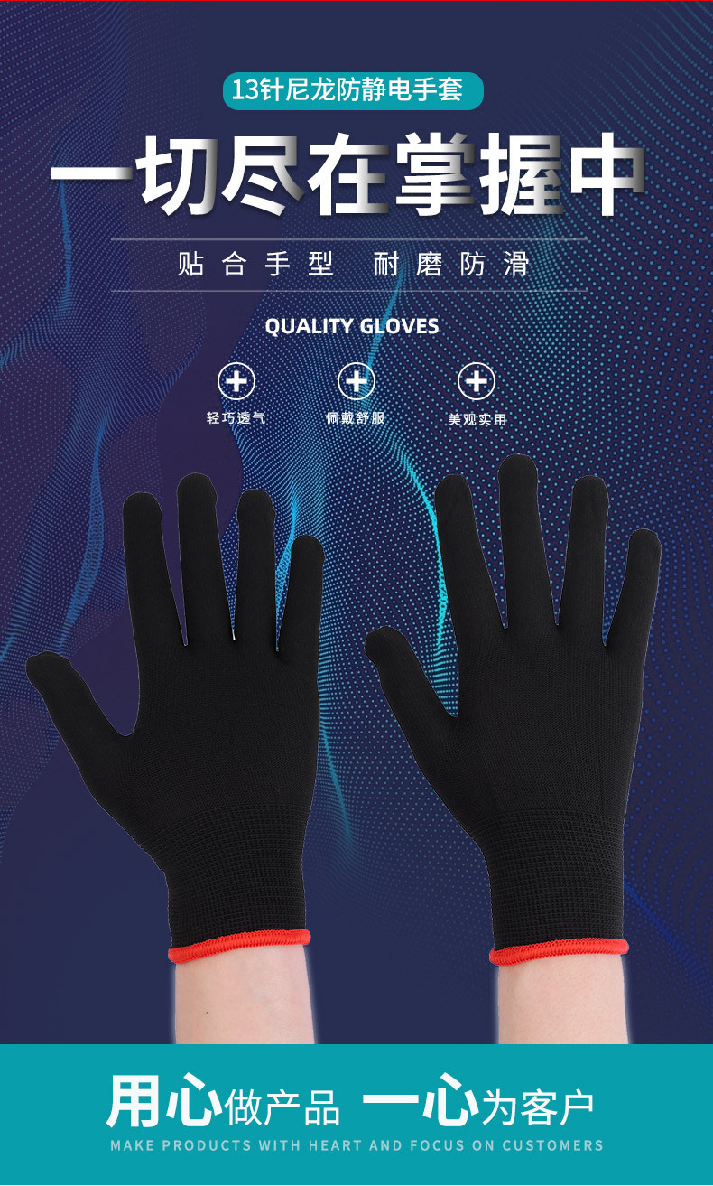 제조업체 도매 13핀 나일론 노동 보호 장갑 내마모성 및 편안한 검정색 고급 통기성 미끄럼 방지 작업용 폴리 에스터