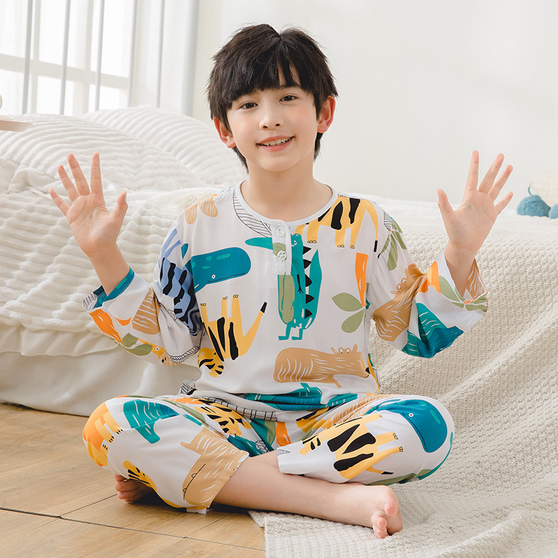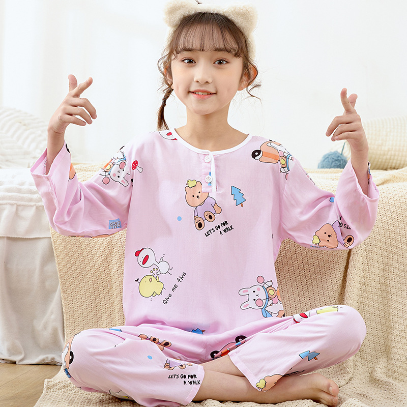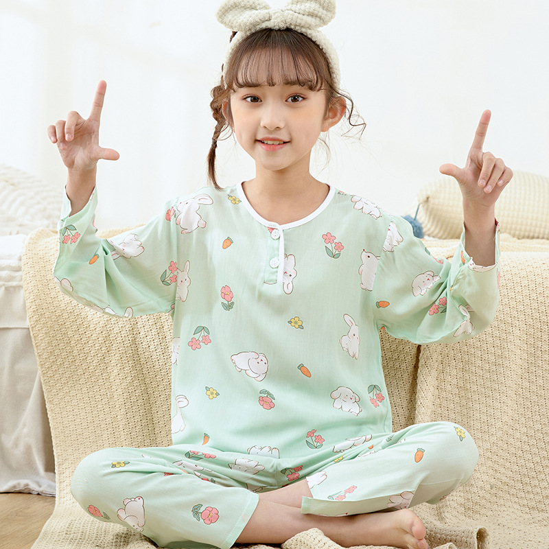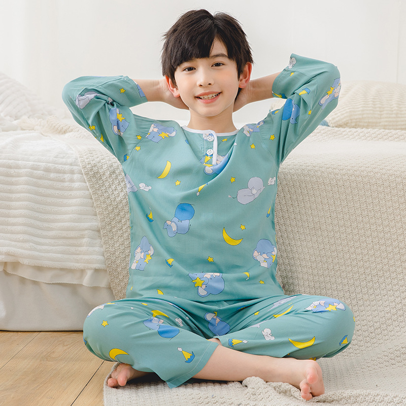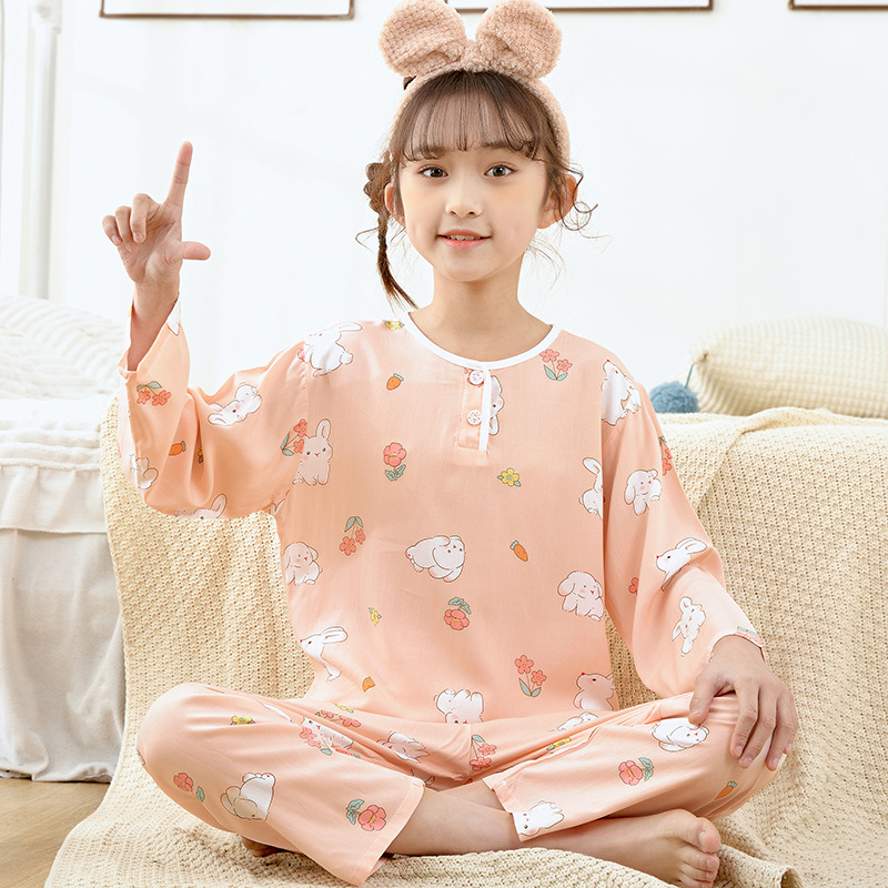 새로운 아동용 면화 실크 잠옷 여름 얇은 소년 소녀면 실크 긴 소매 세트 lyocell 홈 의류 도매스토어 가기