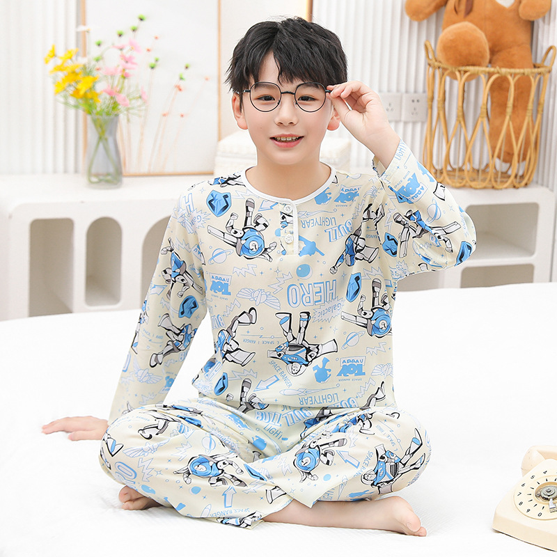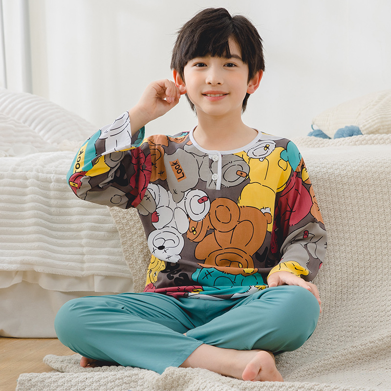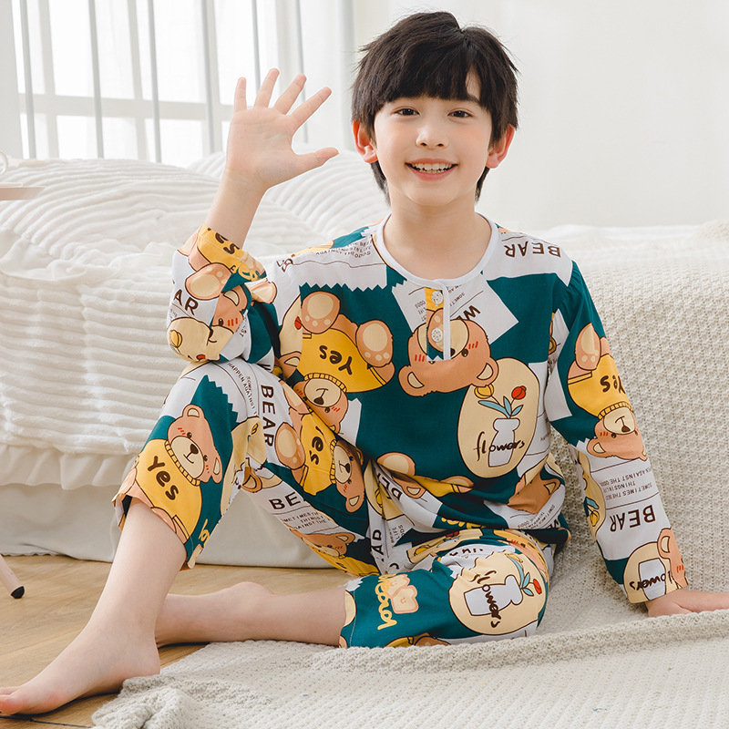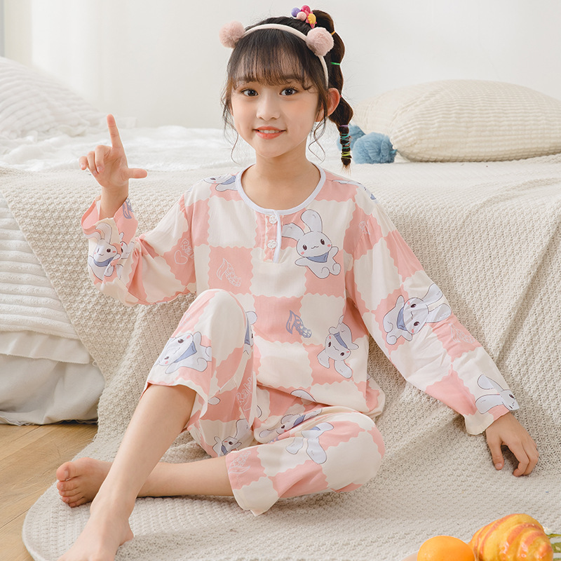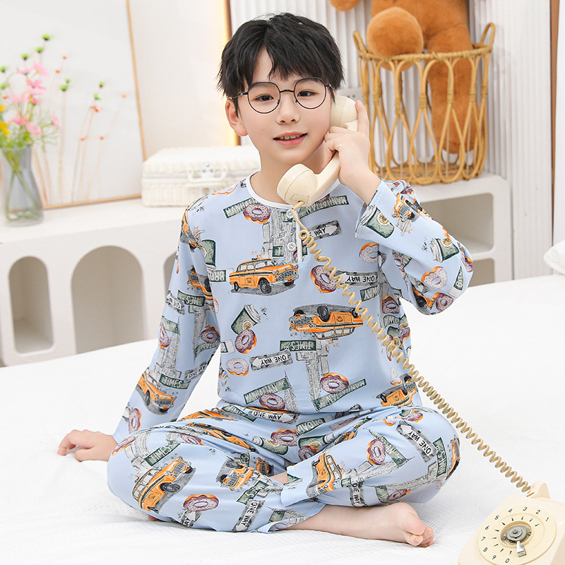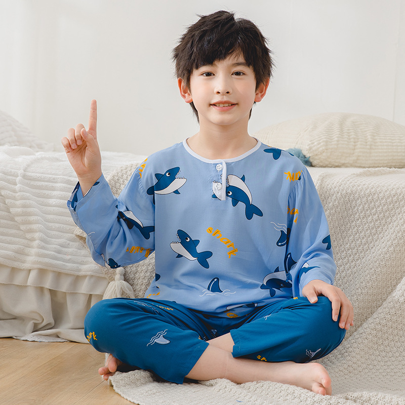 새로운 아동용 면화 실크 잠옷 여름 얇은 소년 소녀면 실크 긴 소매 세트 lyocell 홈 의류 도매스토어 가기