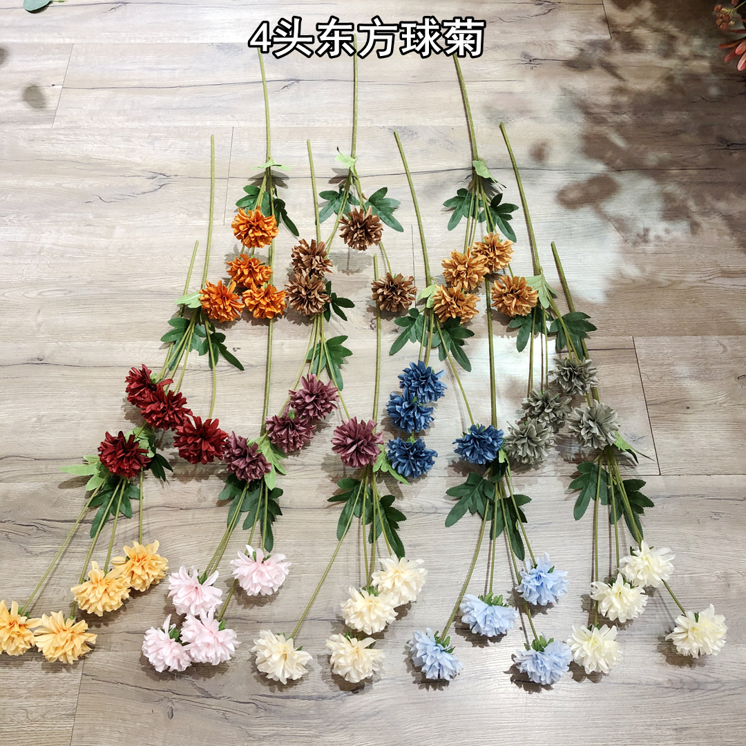 【品名】:新款4头东方球菊 【规格】:整枝长度约60cm,4个球菊花头,花头直径约4-6cm,带叶子。 【可选颜色】:13色可选 【用途】:可以用于直接插花瓶,插花配草,婚庆插花。