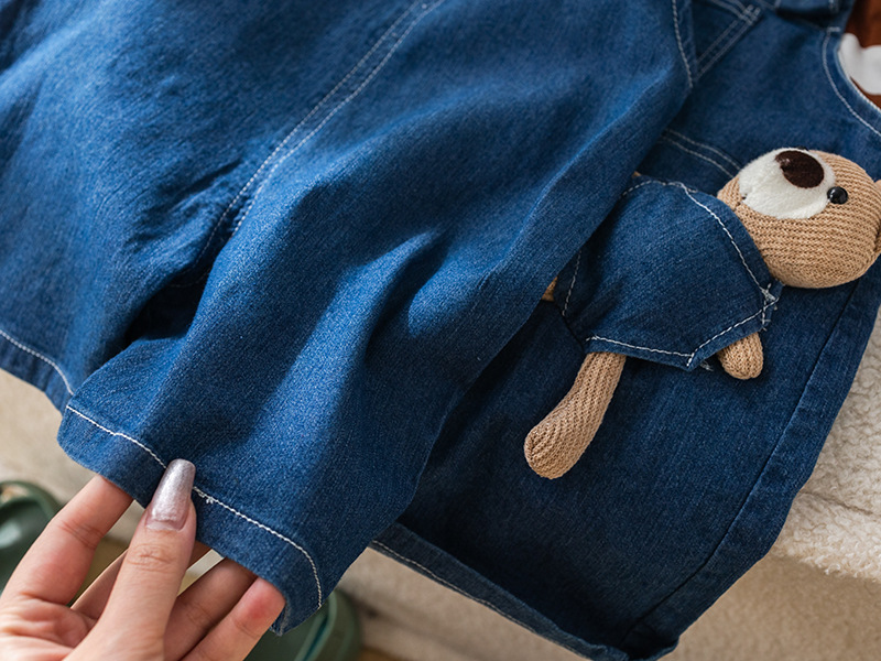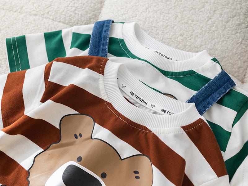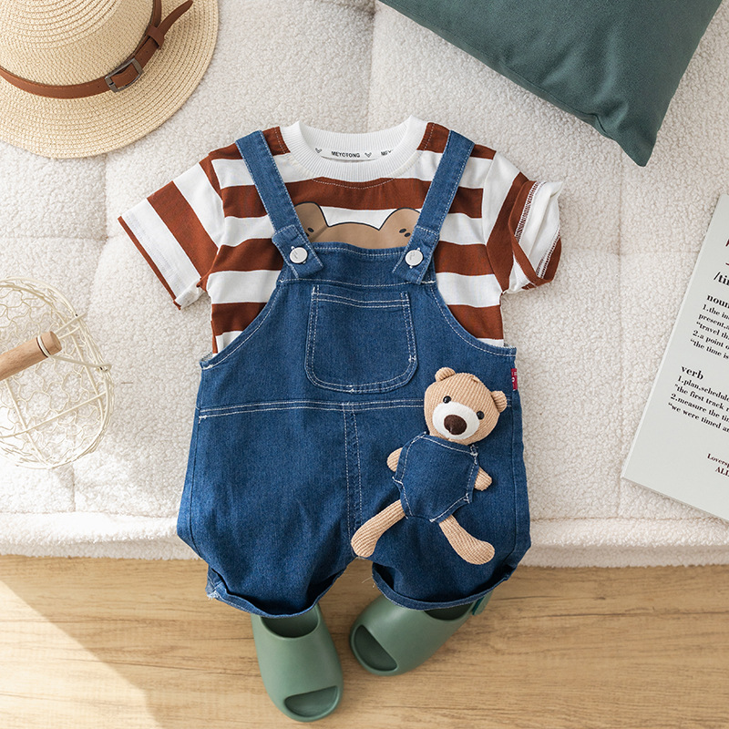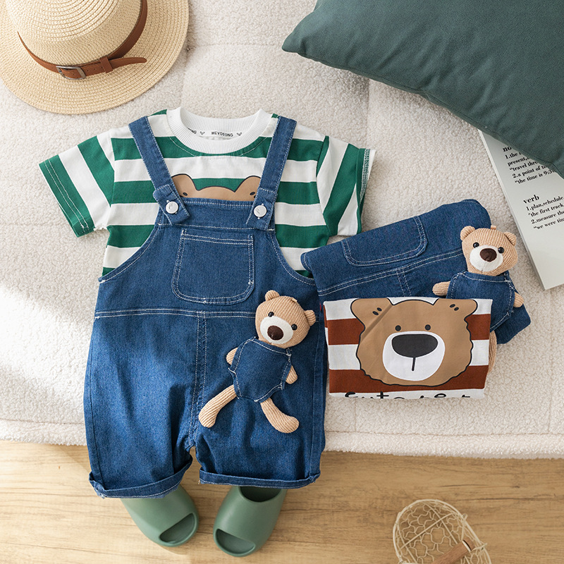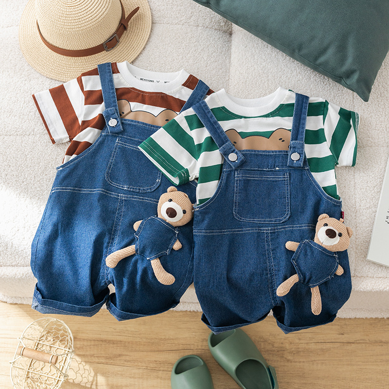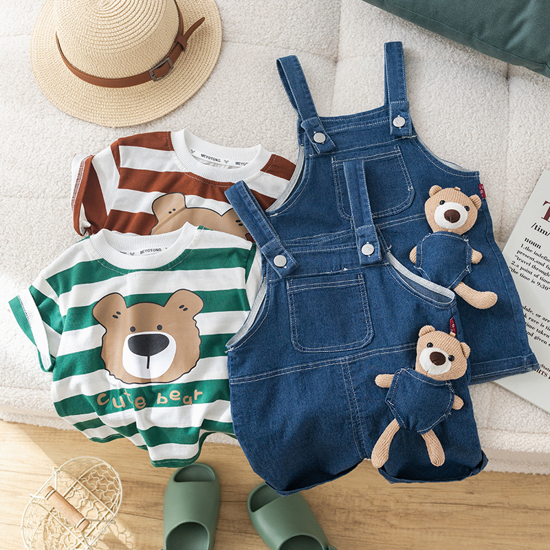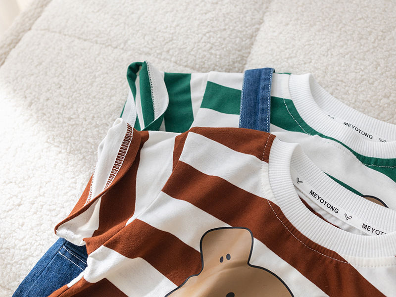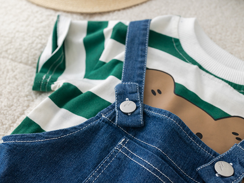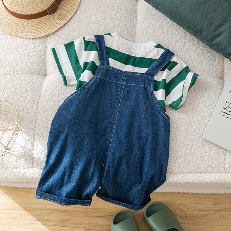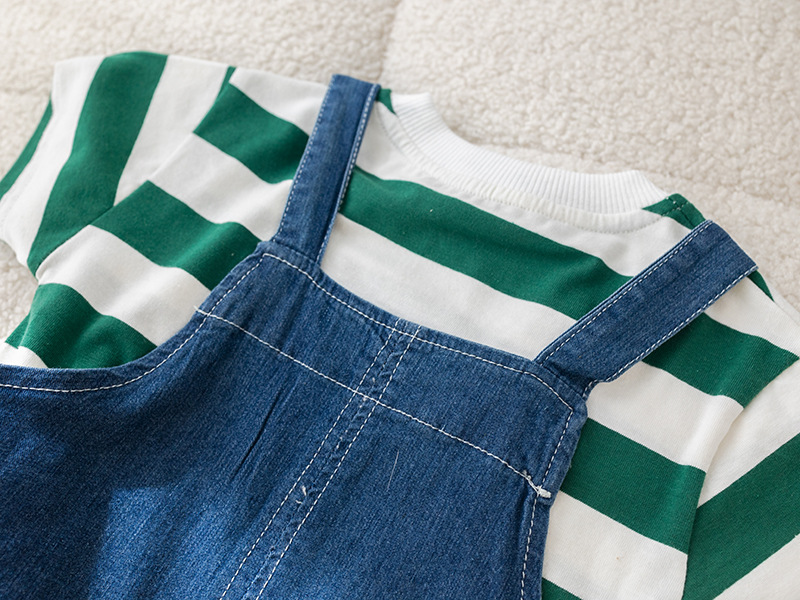 2024 년 아동복 여름 새 멜빵 투피스 세트 한국 줄무늬 둥근 목 캐주얼 세트 여성용 중소형 아동복스토어 가기