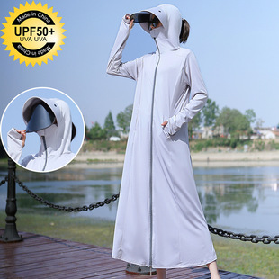 防晒衣加长款女防紫外线遮阳服带帽遮脸夏季过膝长袖冰丝宽松薄衫