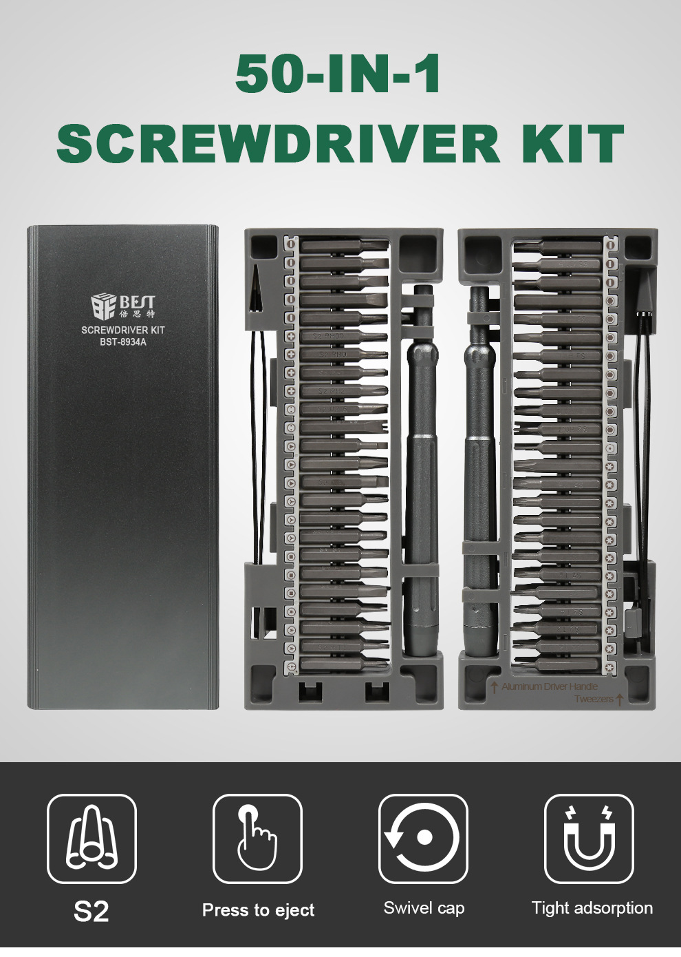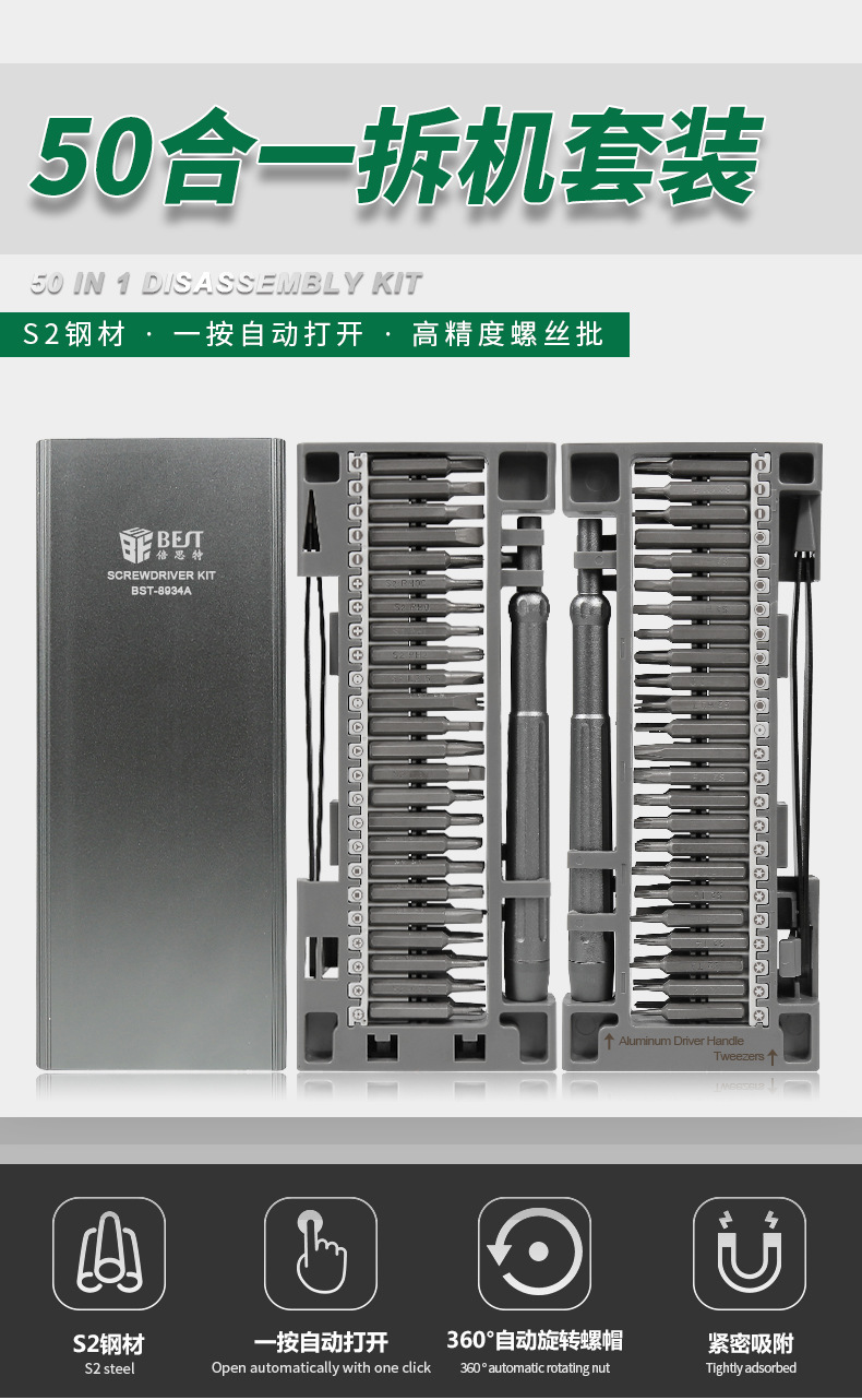 최고의 드라이버 8934A 고정밀 50-in -1 휴대 전화 수리 S2 강철 분해 도구 기장 나사 세트