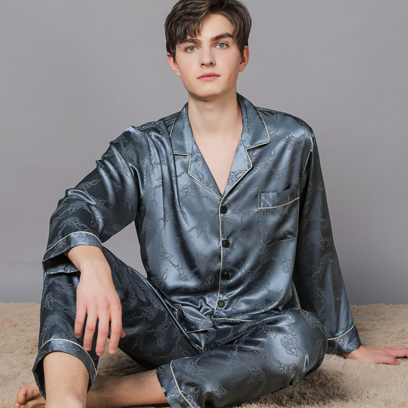 봄과 여름 남성 실크 긴팔 바지 얇은 격자 무늬 잠옷 시뮬레이션 실크 중년 남성 가정 의류 도매