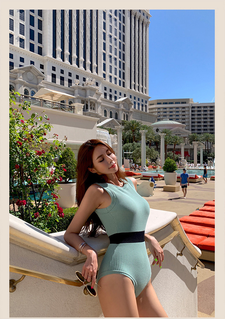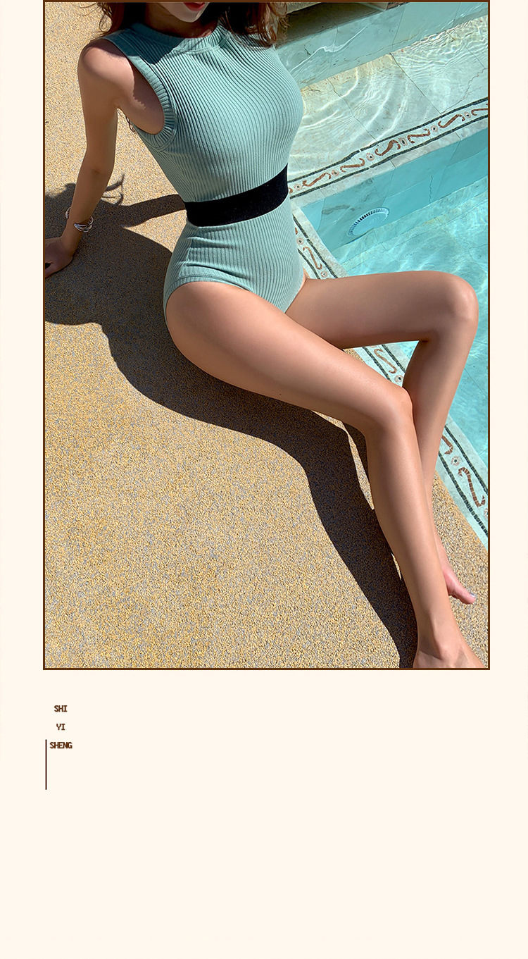 공장 수영복 한국 in 스타일 블루 원피스 하이 칼라 수영복 여성의 섹시 슬림 배꼽 커버 보수적 인 온천 수영복스토어 가기