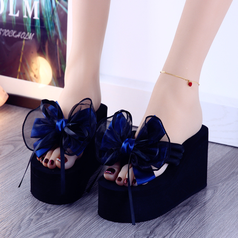 한국식 보우 플립 플롭 여름 두꺼운 밑창 웨지 샌들 여성용 미끄럼 방지 슬리퍼 하이힐 플립 플롭 비치 슬리퍼스토어 가기