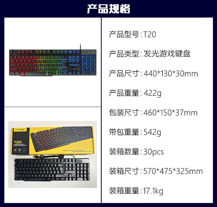 T-WOLF 천둥 늑대 T20 빛나는 게임 키보드 스페인어 러시아어 USB 유선 키보드 중단 국경스토어 가기