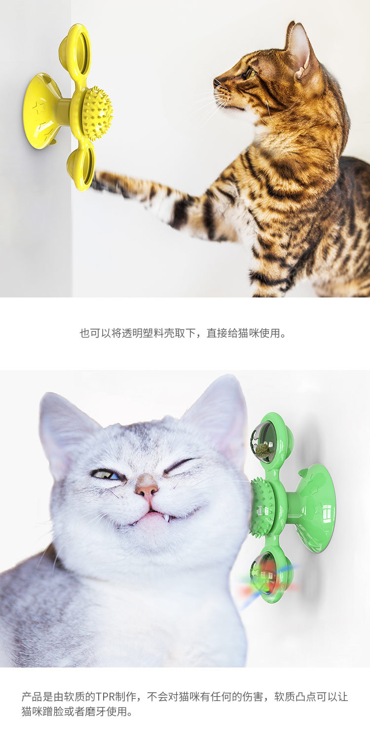 转转风车猫玩具,吸盘底座,可以吸在地板上,门窗上,桌底下,想吸哪里就吸哪里!风车的圆形风叶上有2个透明仓,可以放置发光球、薄荷球吸引猫咪,轻轻拨动风车就会旋转,让猫咪爱不释爪,中间还有蹭毛蹭脸器,所有设计都贴合猫咪设计,舒适的自娱自乐。一个玩具,多种用途。
