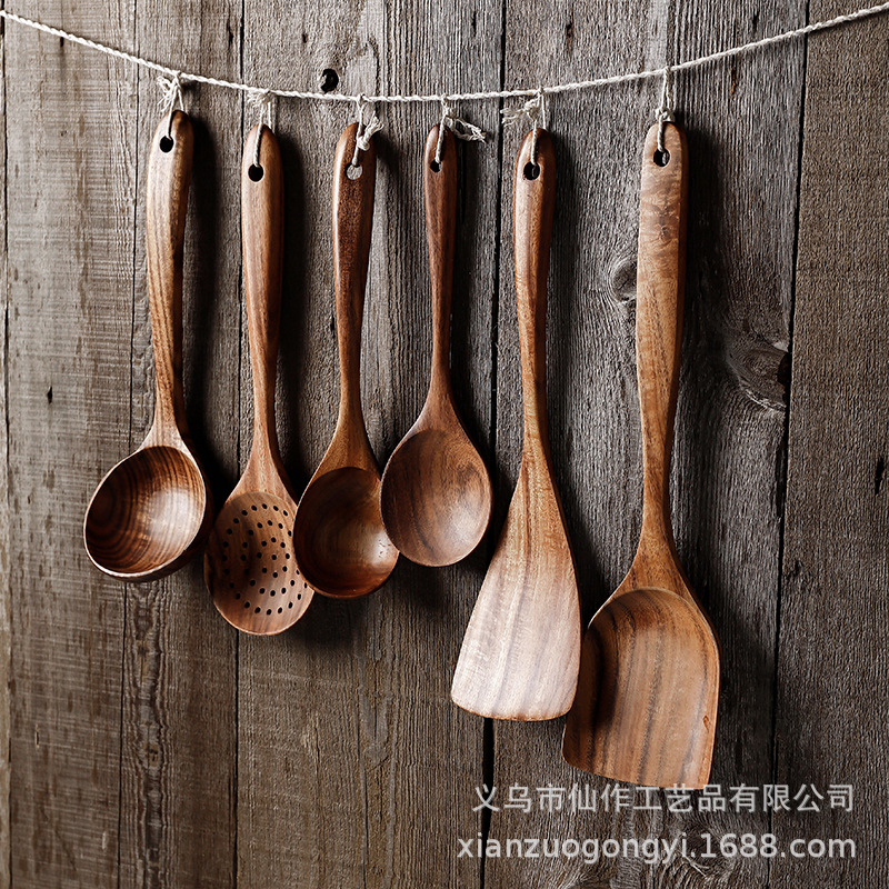 • @小木仙 相思木长柄锅铲抹刀搅拌料理铲跨境柚木厨具5件套装木铲