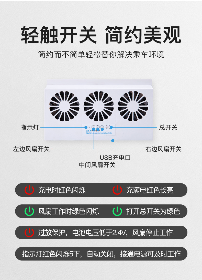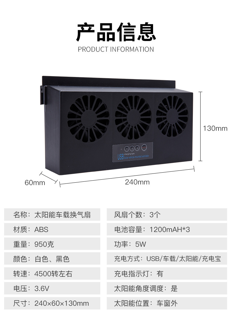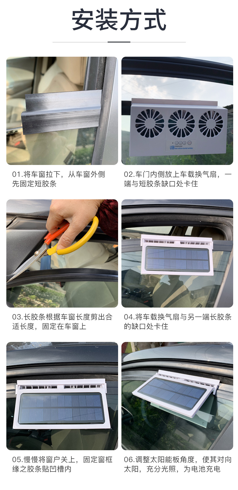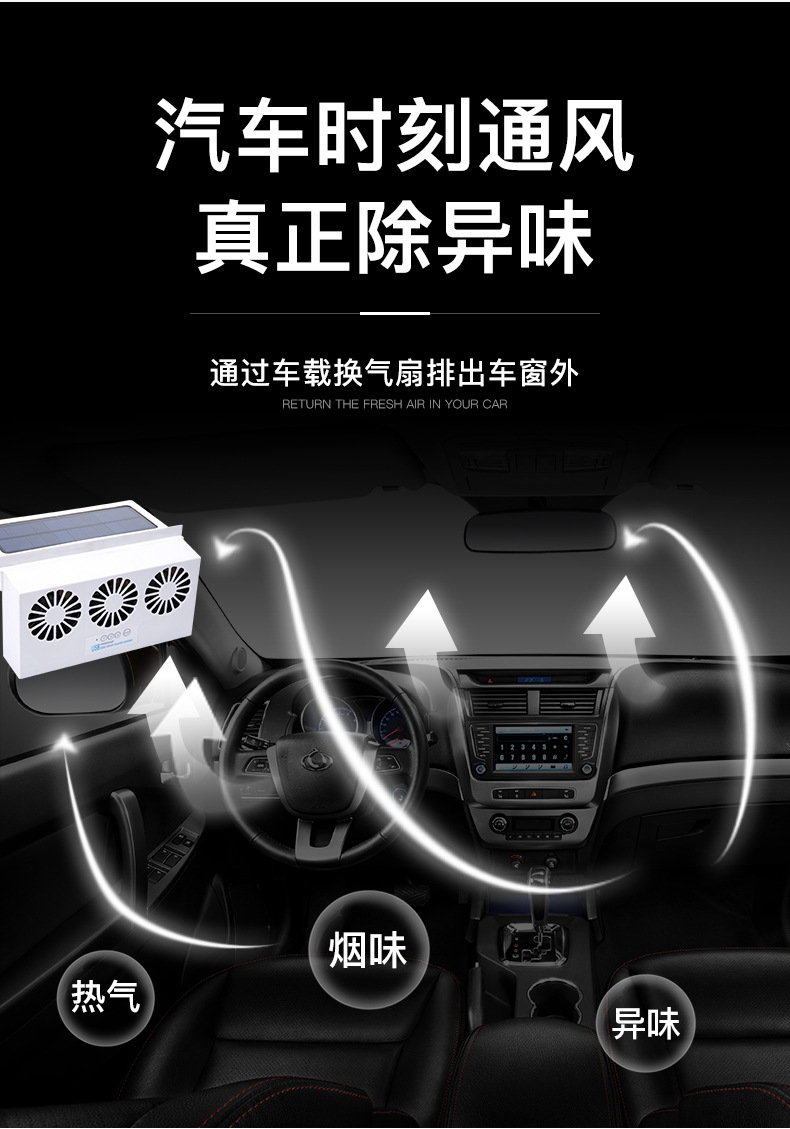 现在好了针对以上的难题,现推出一款利用太阳能转换能量是风扇快速转动,而且是正直的绿色环保产品。只要有太阳光下就会快速运转,10分钟就可以带走汽车内有害气体,换气放毒,有车者必不可少!