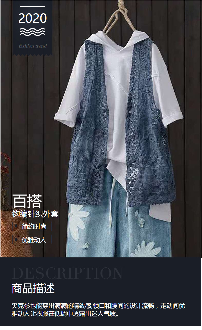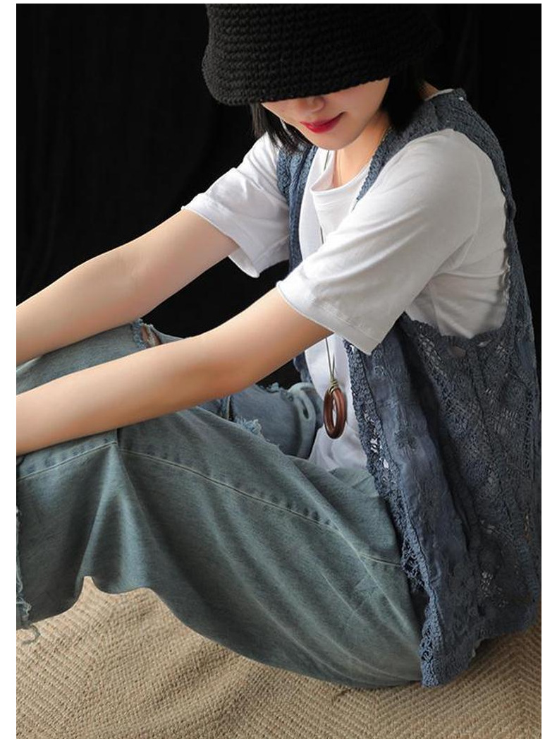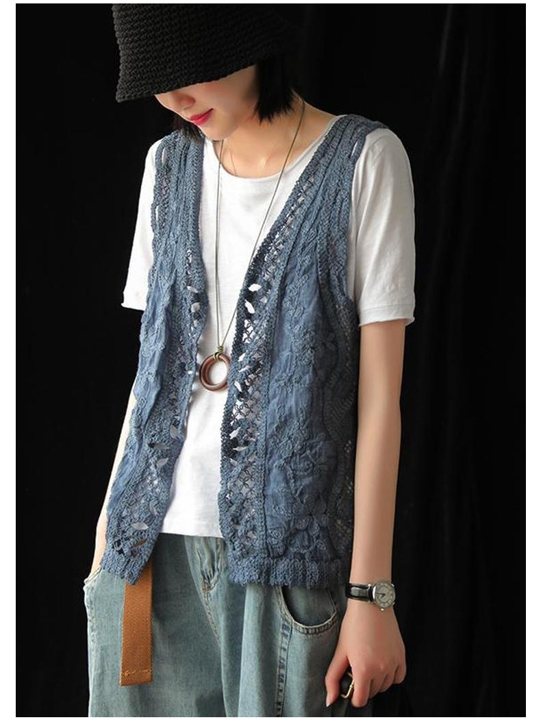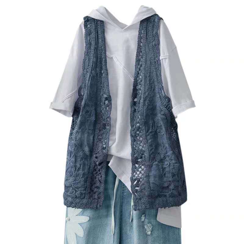 여름과 가을 중공 조끼 여자의 모든 매치 데님 난초 문학 레트로 코튼 린넨 레이스 니트 조끼 카디건 조끼 탑
