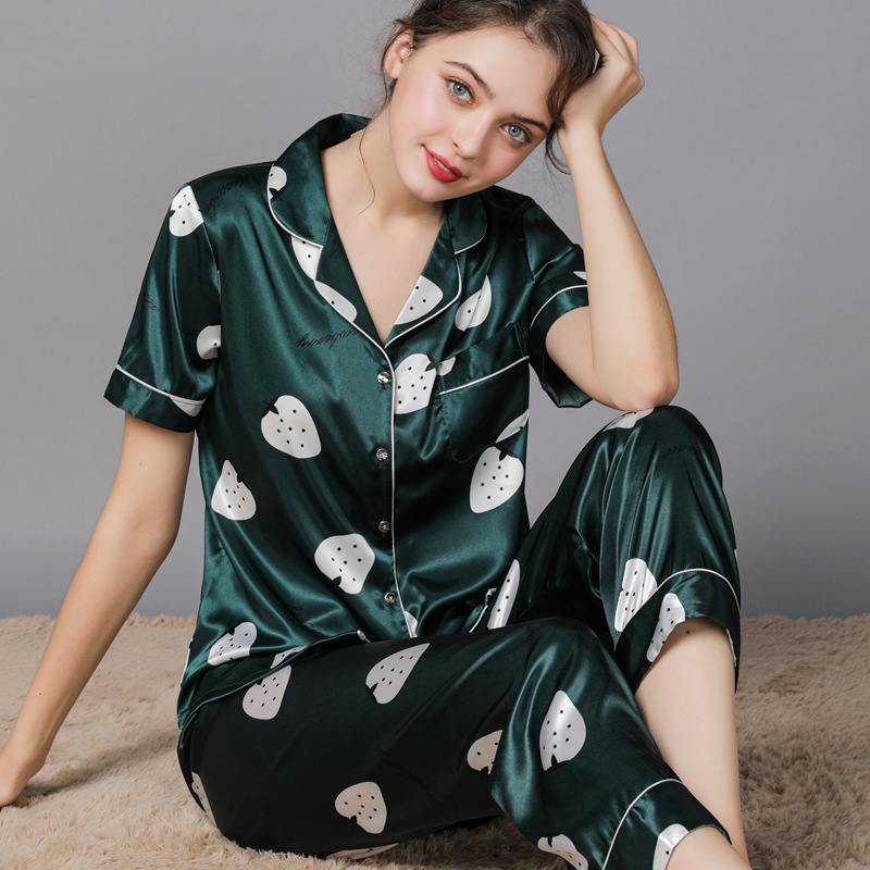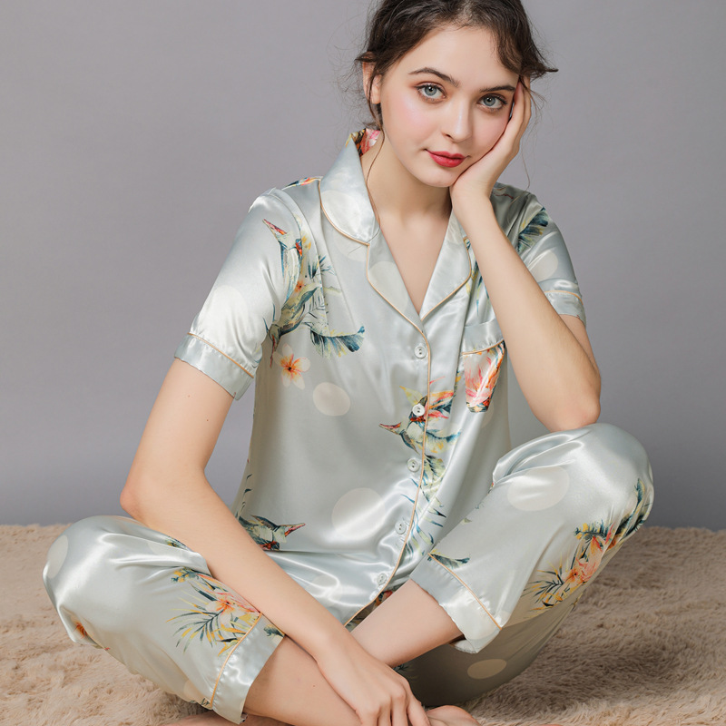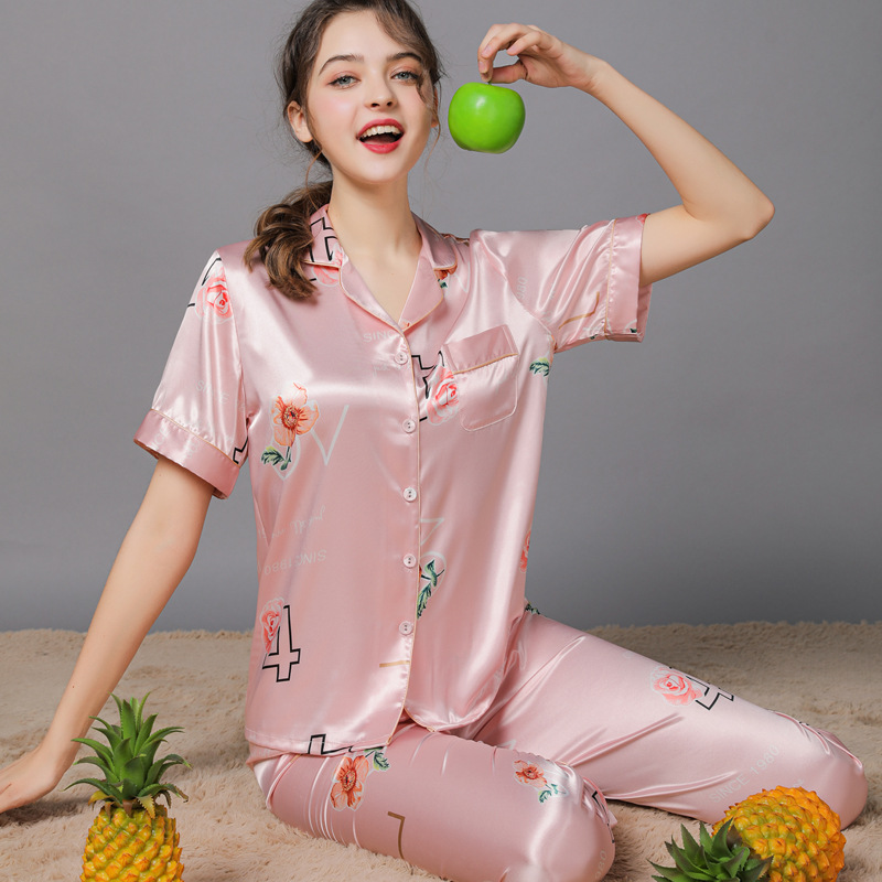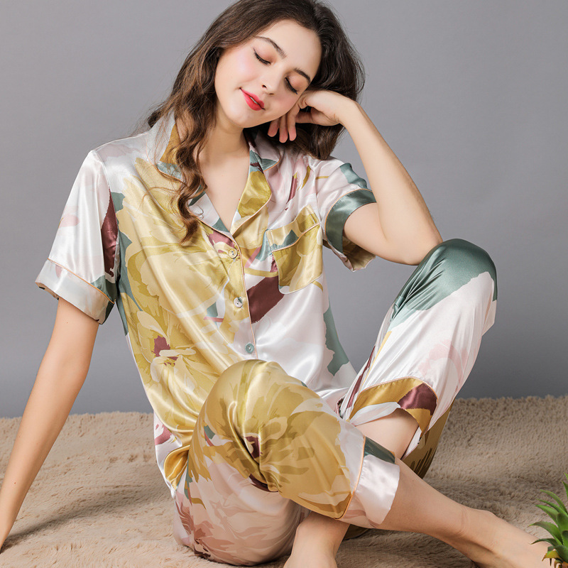 여자의 여름 실크 잠옷 반팔 인쇄 아이스 실크 세트 봄 실크 카디건 캐주얼 얇은 가정 옷