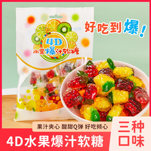 4D水果爆汁软糖果200g袋装橡皮糖草莓葡萄果味夹心爆浆零食品整箱