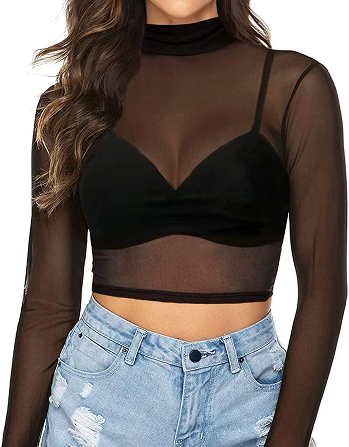 유럽과 미국 국경 간 대외 무역 여성용 메쉬 중공 나비 프린트 여성용 긴팔 배꼽 짧은 티셔츠 여성용 베이스 셔츠스토어 가기