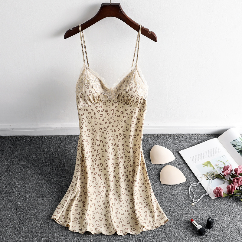 여름 섹시한 얼음 실크 잠옷 극단적 인 유혹 핑크 표범 잠옷 여자의 레이스 슬링 잠옷 가슴 패드와 한국 스타일
