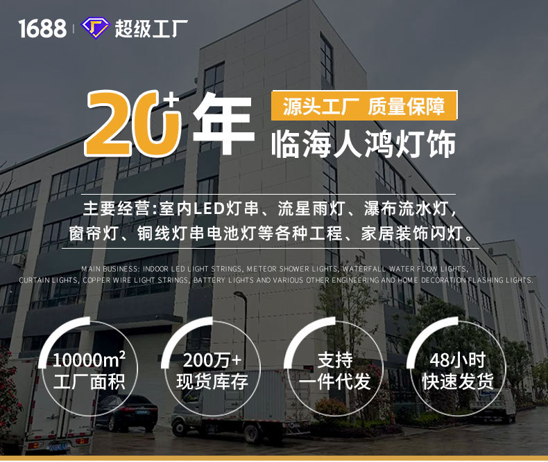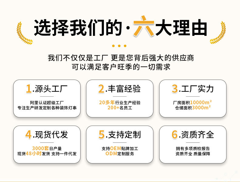 因为我们有20多年的室内LED灯串的生产经验,口碑好,深受品牌商青睐,所以我们的工厂更值得广大群体的信赖,违约风险低。