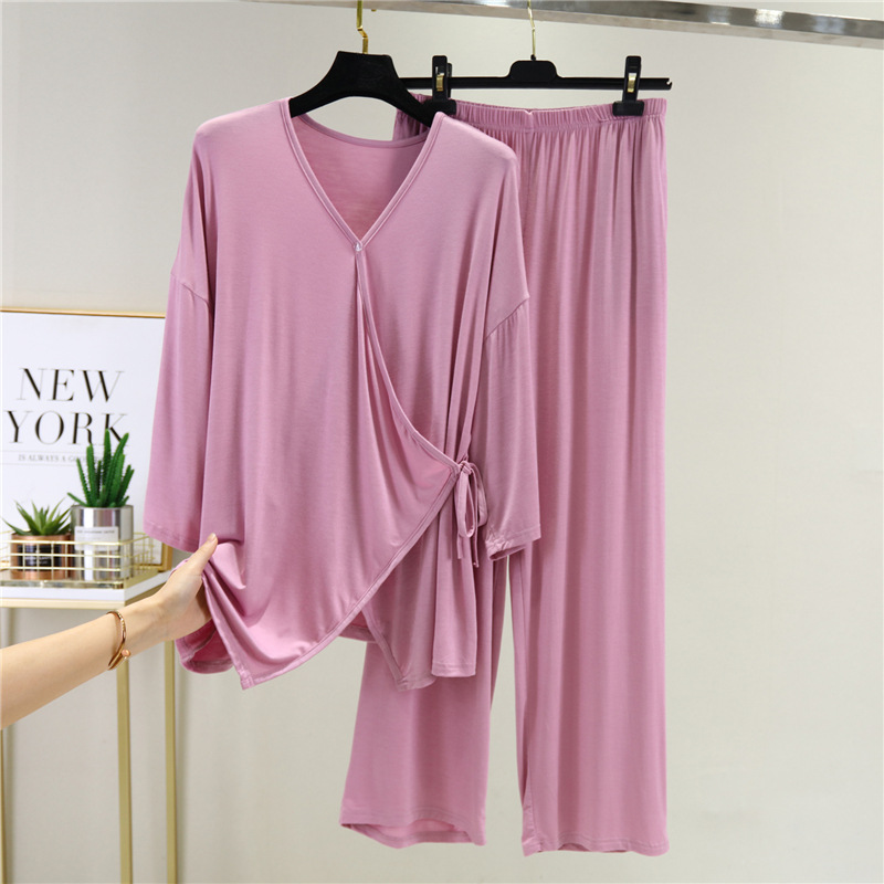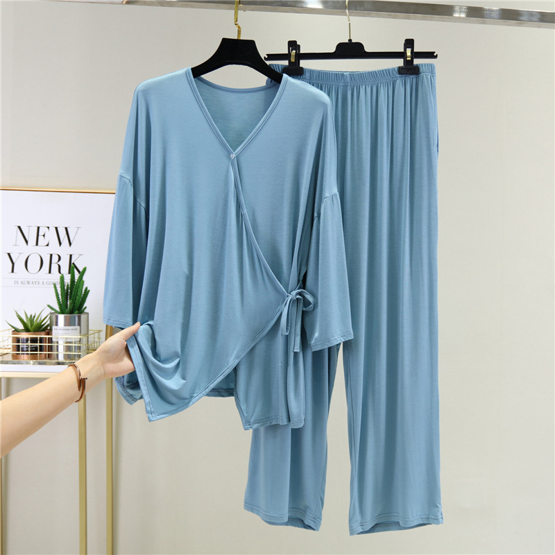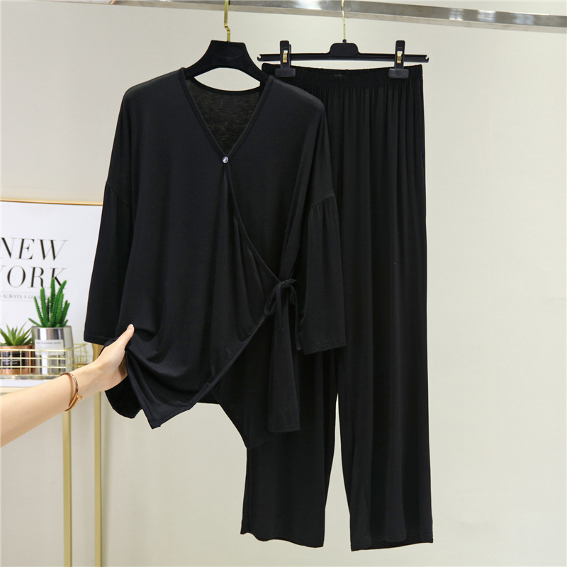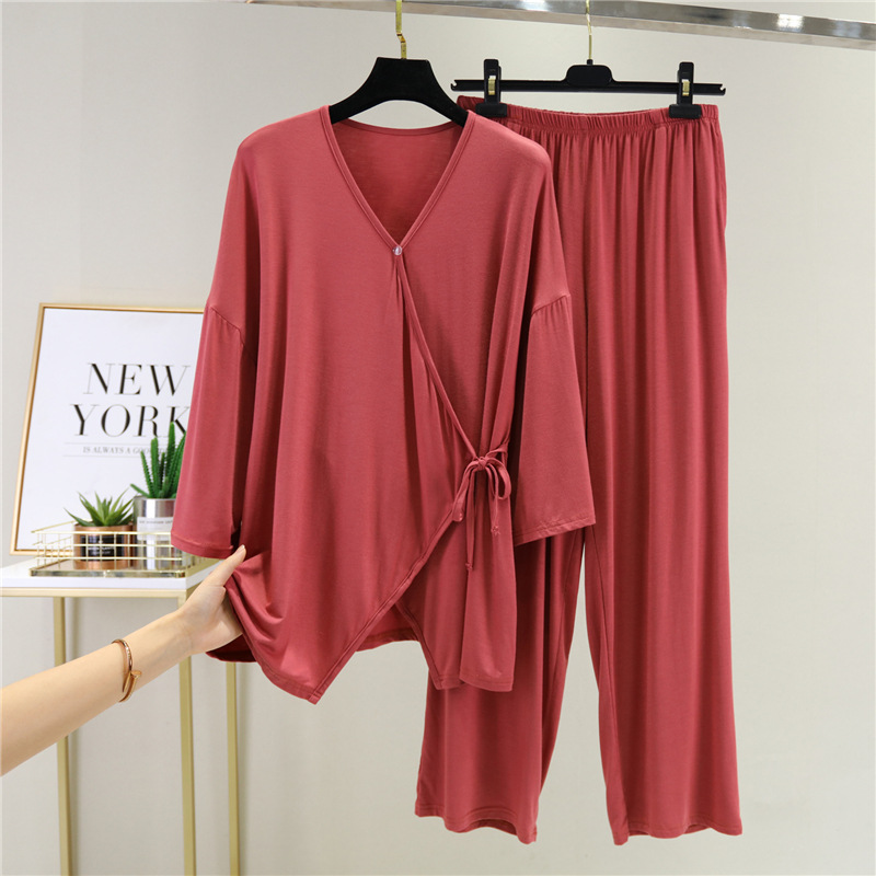 모달 잠옷 투피스 세트 여성용 여름 얇은 V-넥 반팔 레이스업 가디건 루즈한 탑 가정복 잠옷