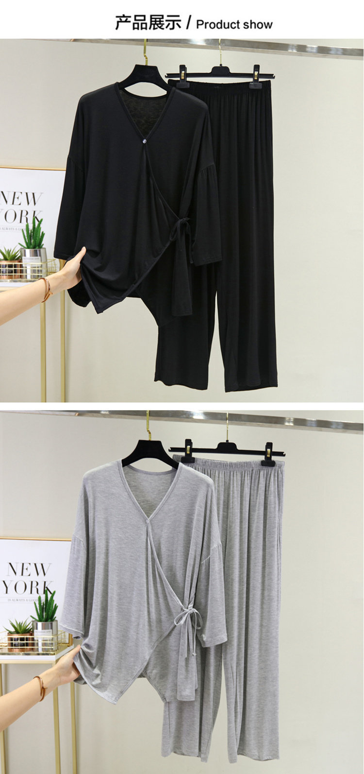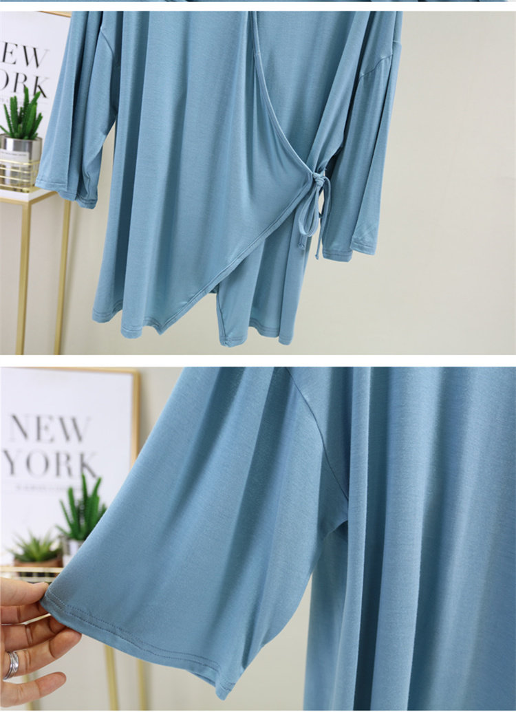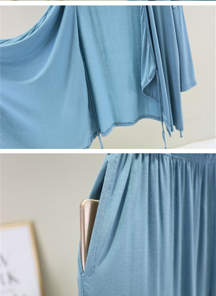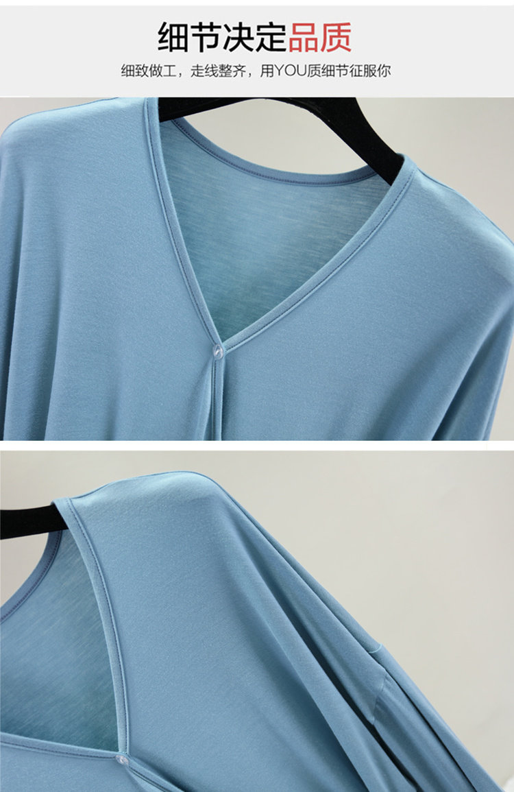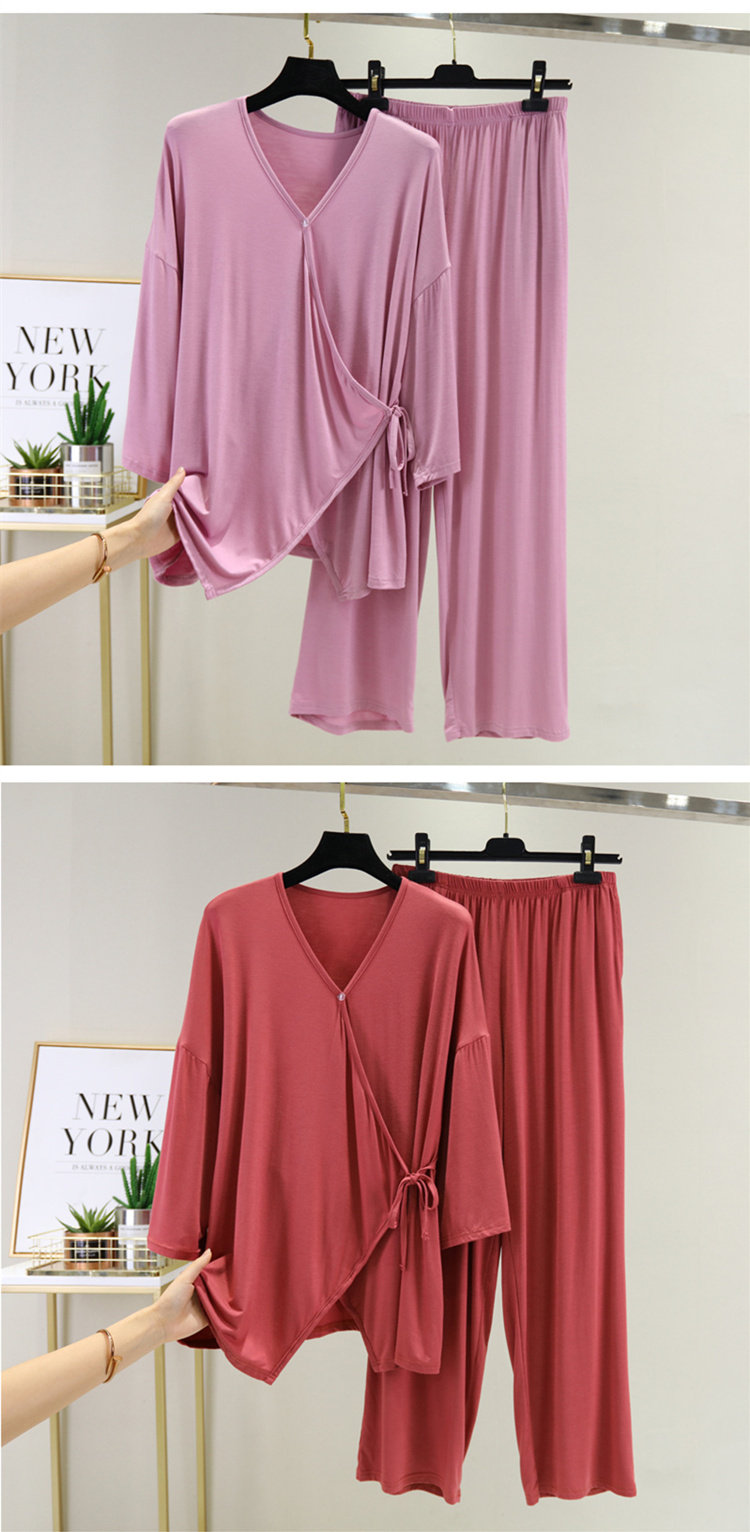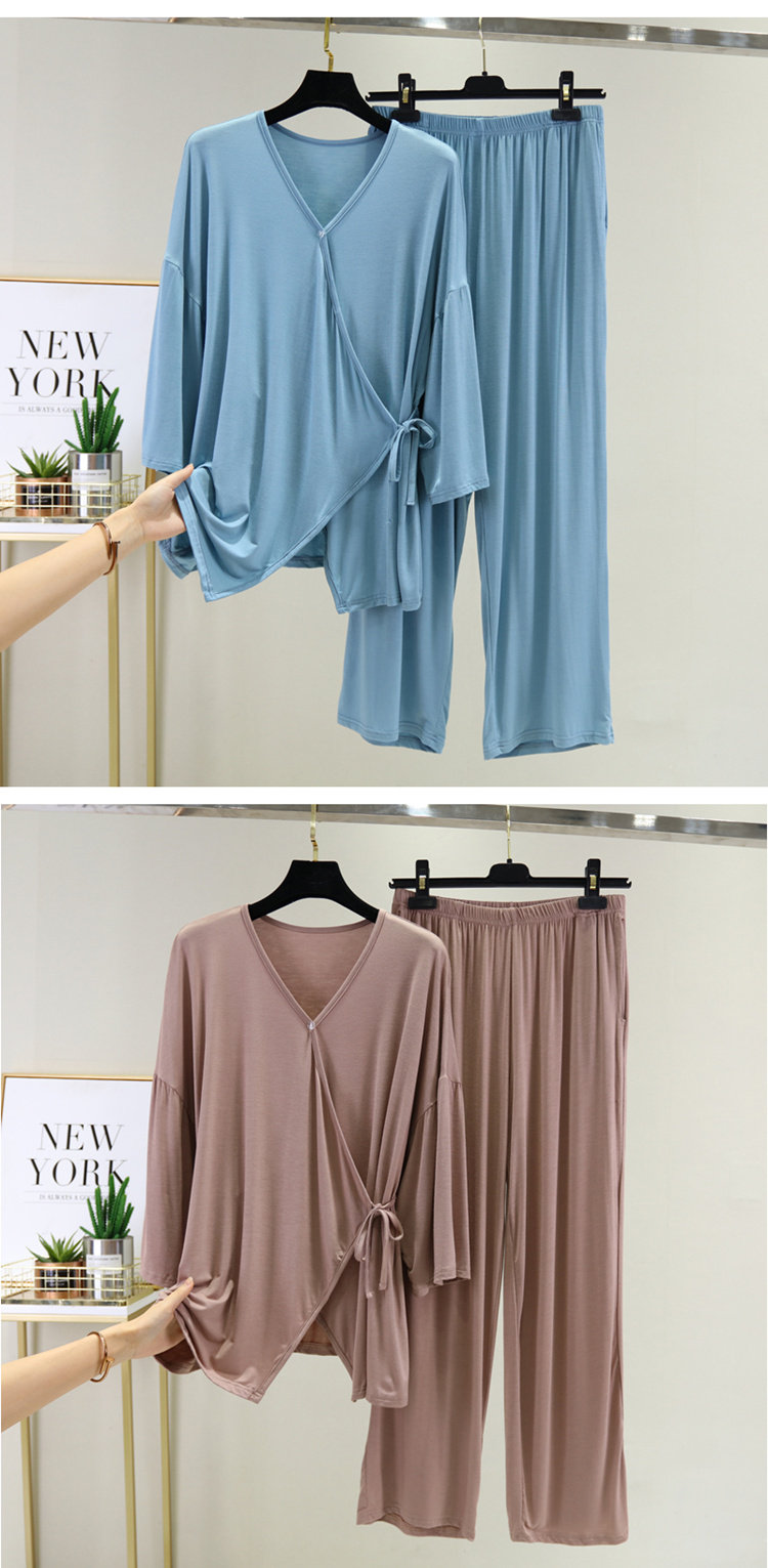 모달 잠옷 투피스 세트 여성용 여름 얇은 V-넥 반팔 레이스업 가디건 루즈한 탑 가정복 잠옷스토어 가기