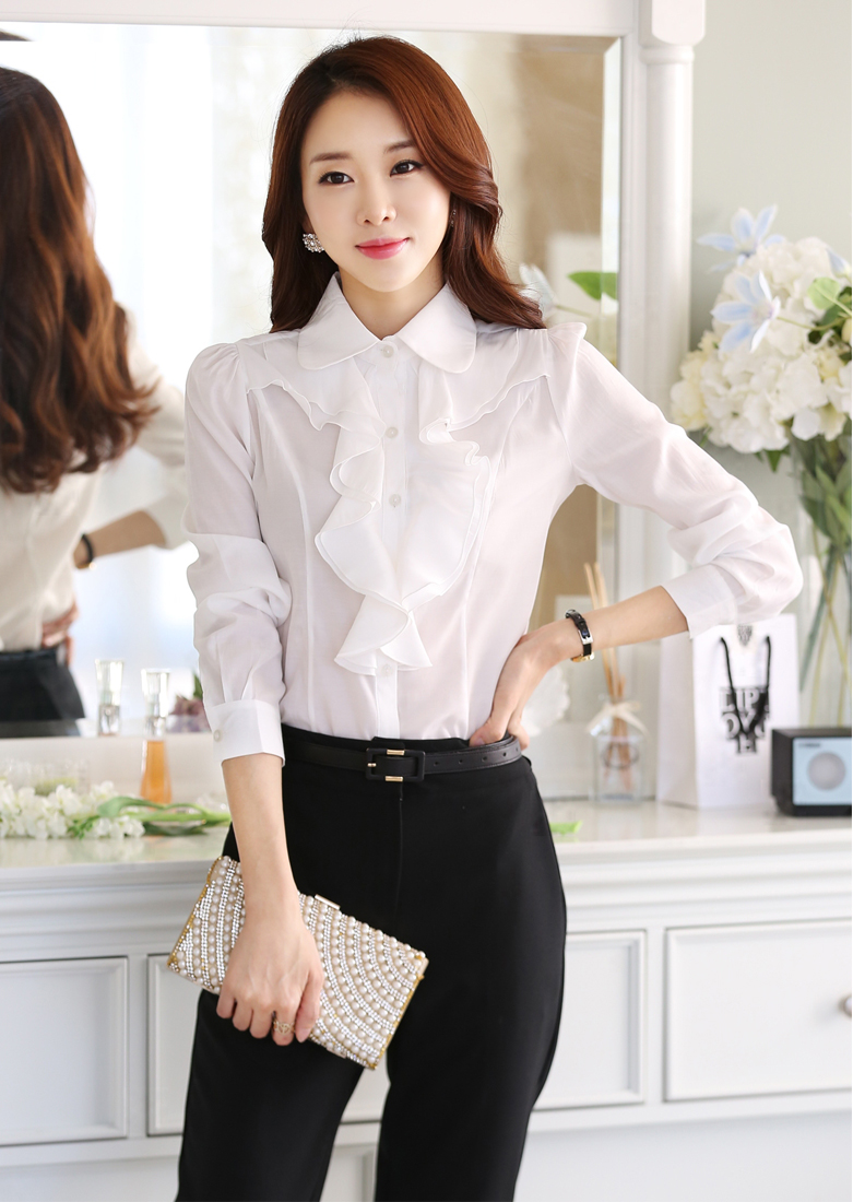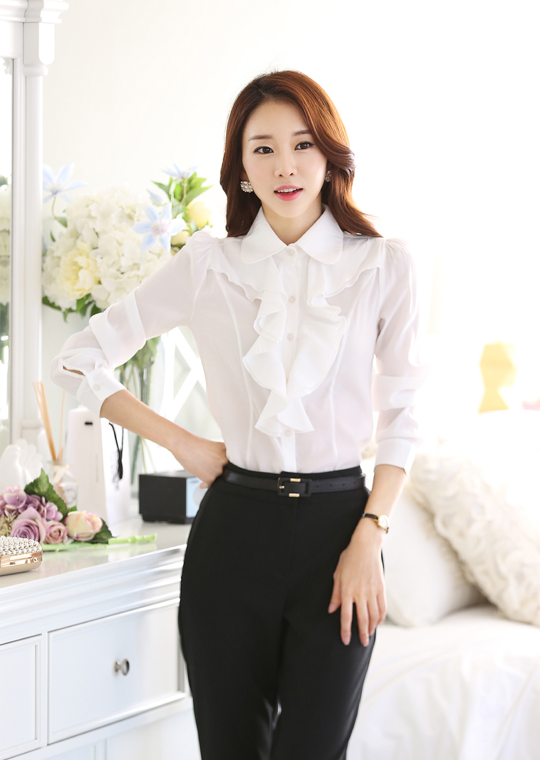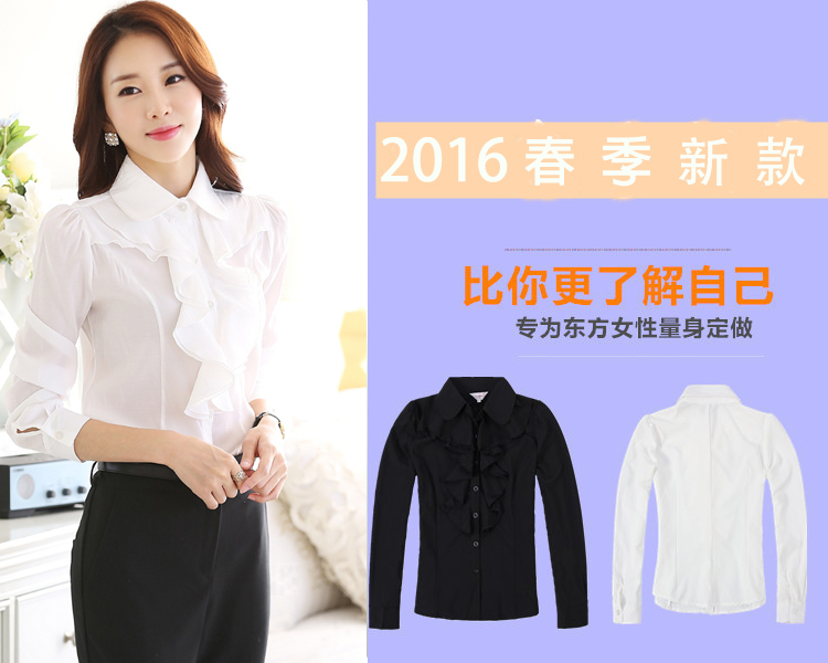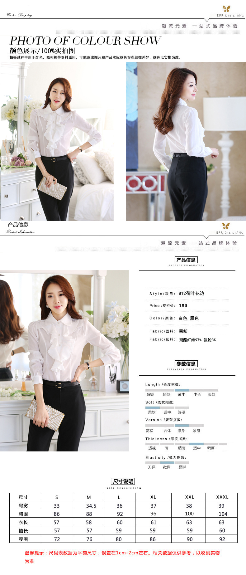 产品特点:采用立体修身裁剪,简约时尚的设计,非常具有OL通勤气质的衬衫,极富女人味的工艺进行整合,女性化十足的贴合曲线度;精致剪裁的胸前小褶皱花边衬托女性美感!