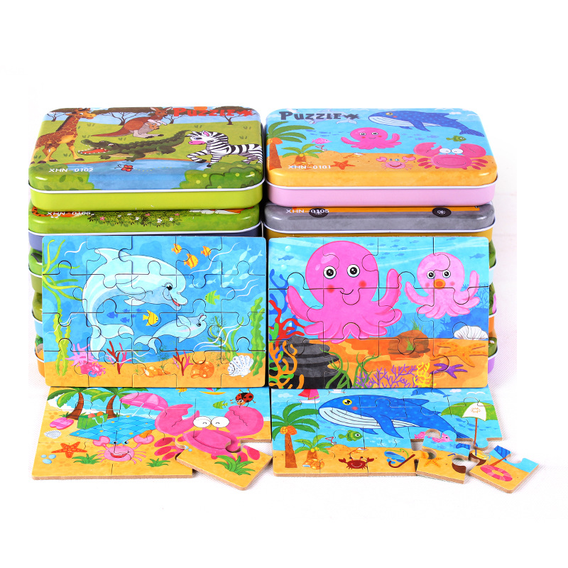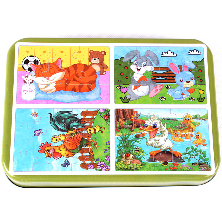 어린이 직소 4 대 1 나무 직소 퍼즐 철 박스 어린이 혜택 지능 만화 빌딩 블록 장난감 조립 게임스토어 가기
