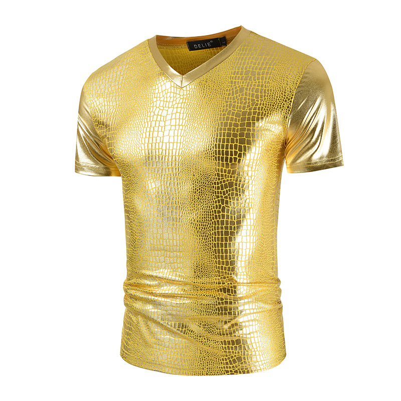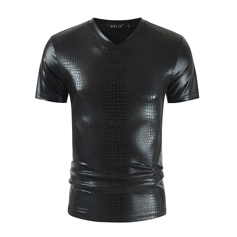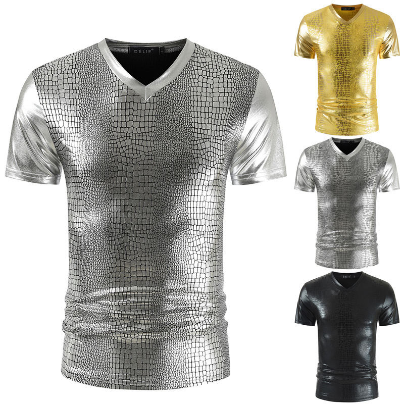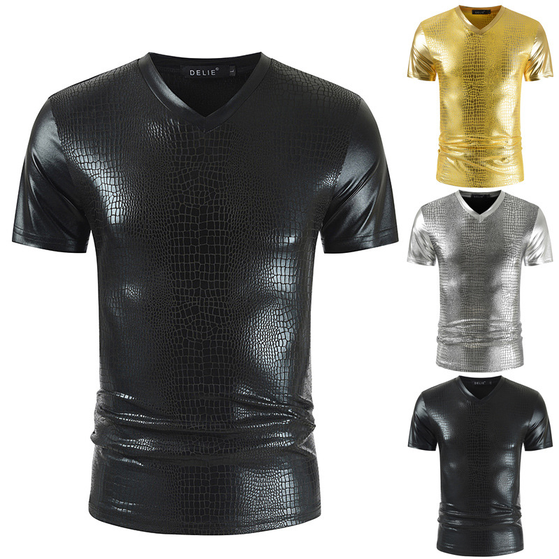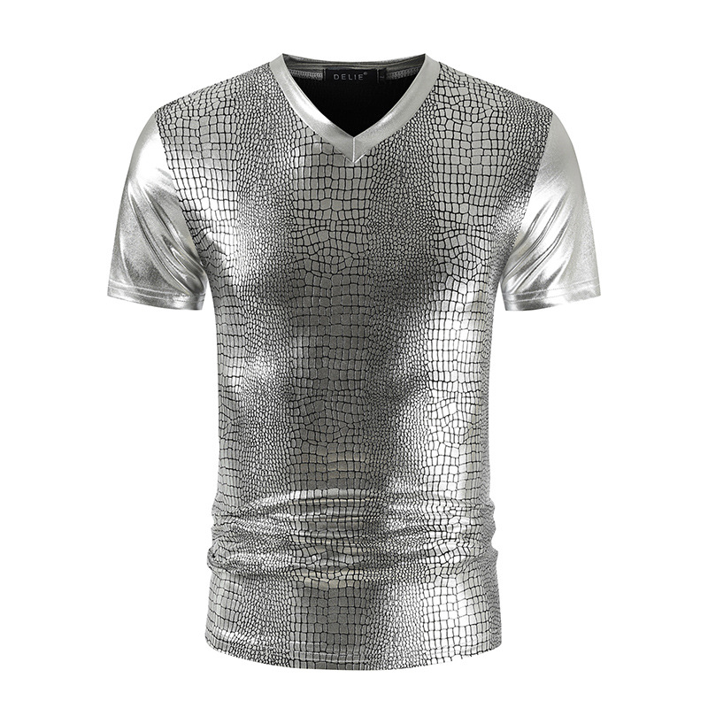 2023 여름 새로운 크로스 보더 V-넥 슬림핏 반팔 티셔츠 뱀가죽 패턴 트렌디 남성용 밝은 나이트 클럽 스타일 남성용 베이스 셔츠스토어 가기