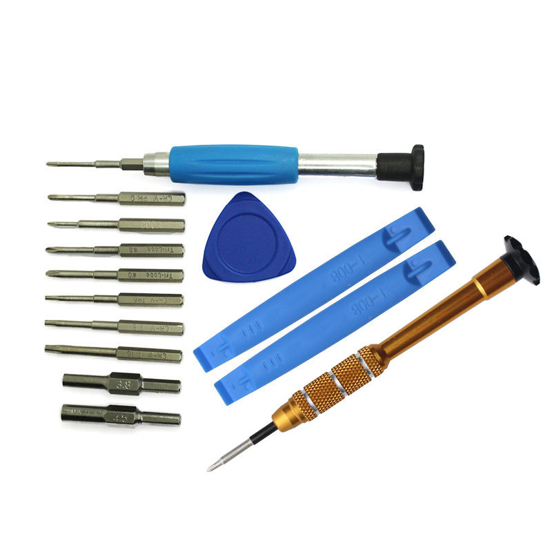 配置:内六角3.8mm,4.5mm套筒螺丝刀刀头各1个,六角T6带中孔,T8带中孔,T10带中孔刀头各1个,Y2.5,Y2.0,Y1.5刀头各1个,十字2.0,十字1.5刀头各1个,通用刀柄1支,双头蓝色撬棒2个,厚三角拆机片1个,铝合金Y0.6螺丝刀1支;