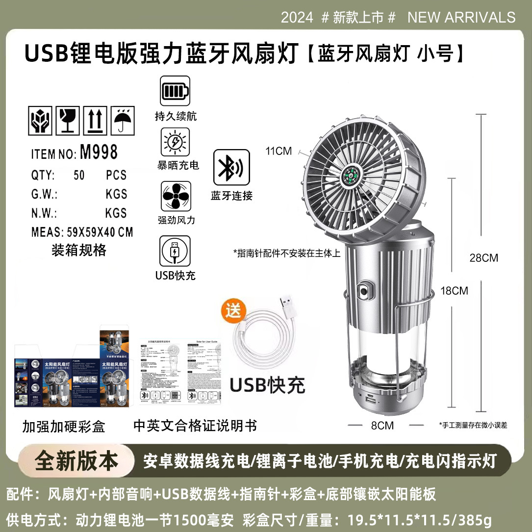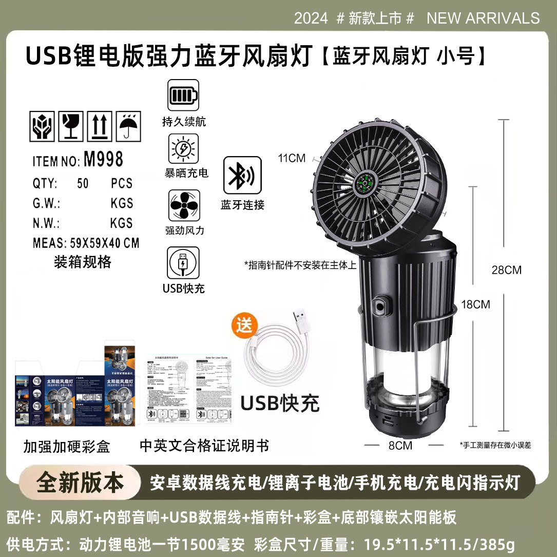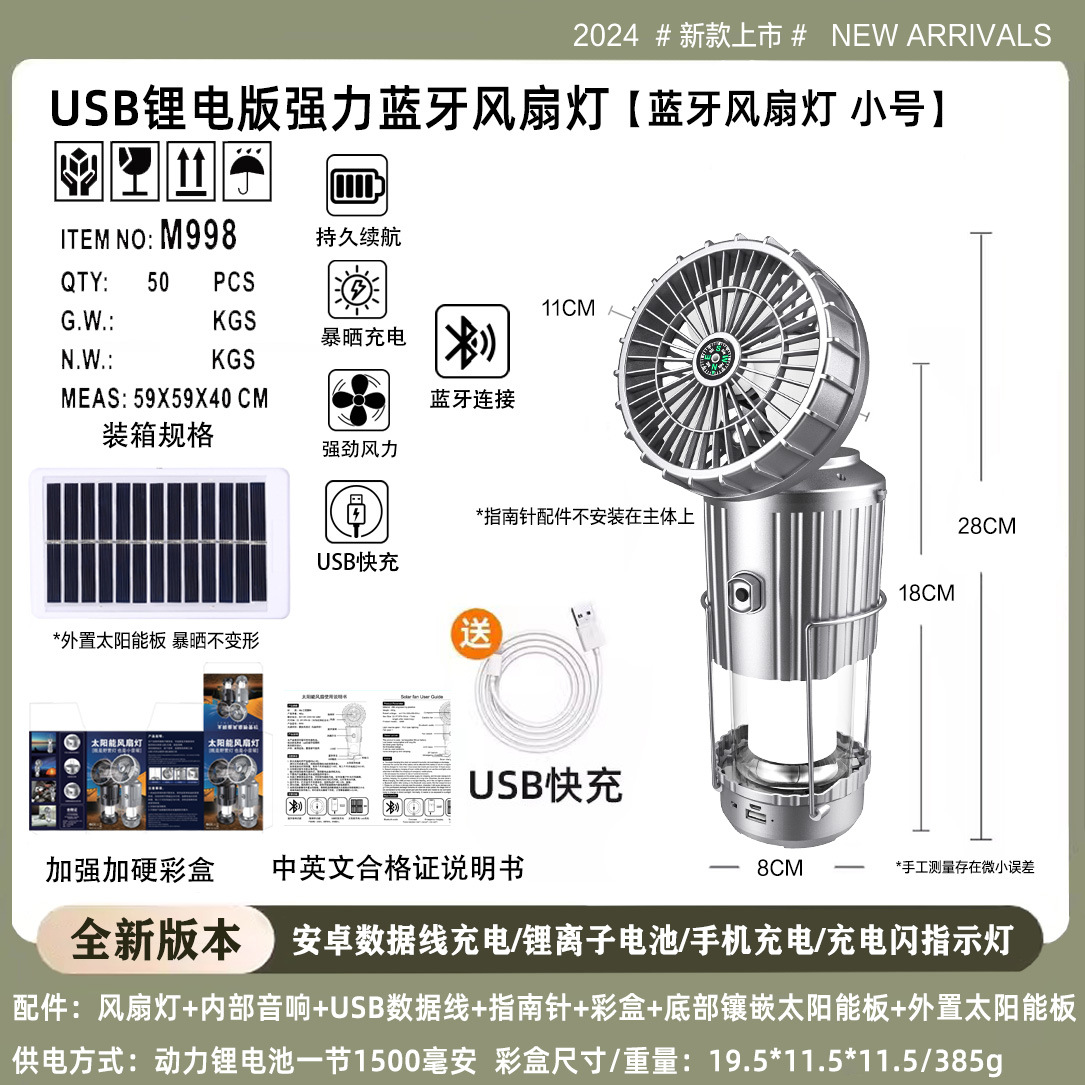 特点:太阳能充电 USB充电 手机连接蓝牙内置音响播放 指南针 充电闪烁指示 加大风力 改用锂电池 续航稳定 充电稳定