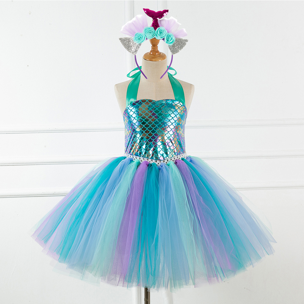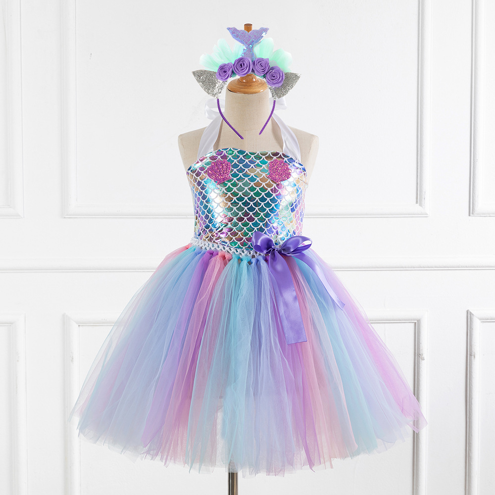 • 欧美童装美人鱼送头饰女童蓬蓬裙cospaly表演连衣裙鱼鳞礼服裙
