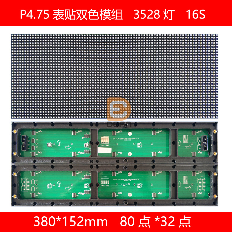 像素点间距:4.75mm 基色:红色 发光点颜色组合:1R1G 封装灯珠:SMD3528灯 物理密度:44321点/平方米 |