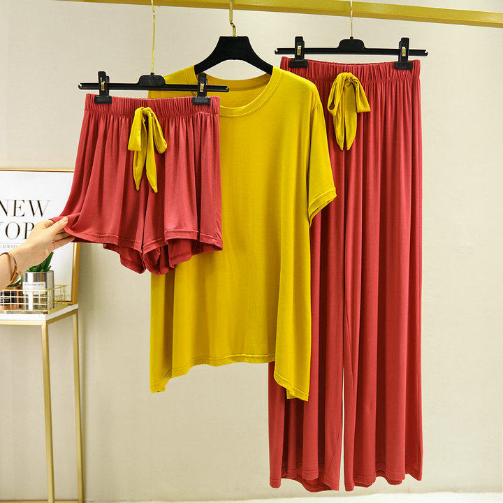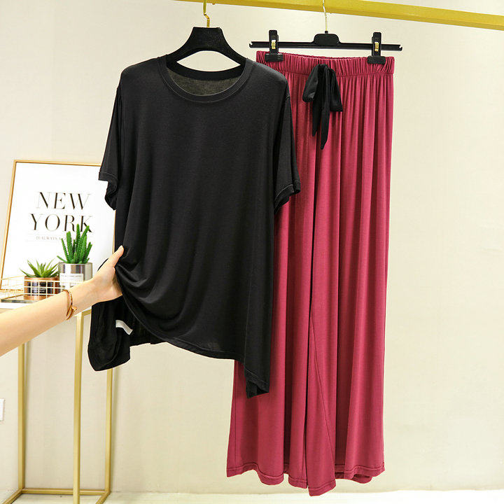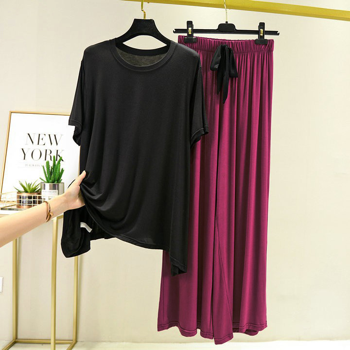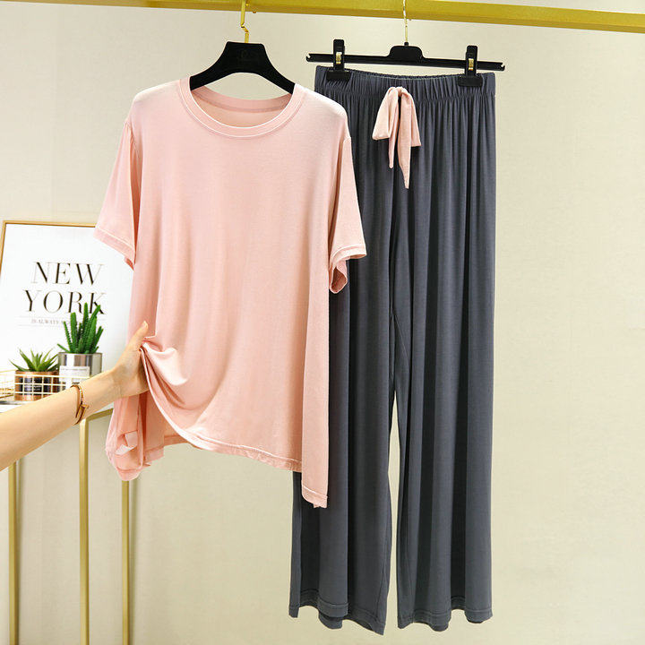 여름 대조 색상 모달 반팔 바지 느슨한 플러스 사이즈 지방 잠옷 가정 옷 세트 캐주얼 스퀘어 댄스