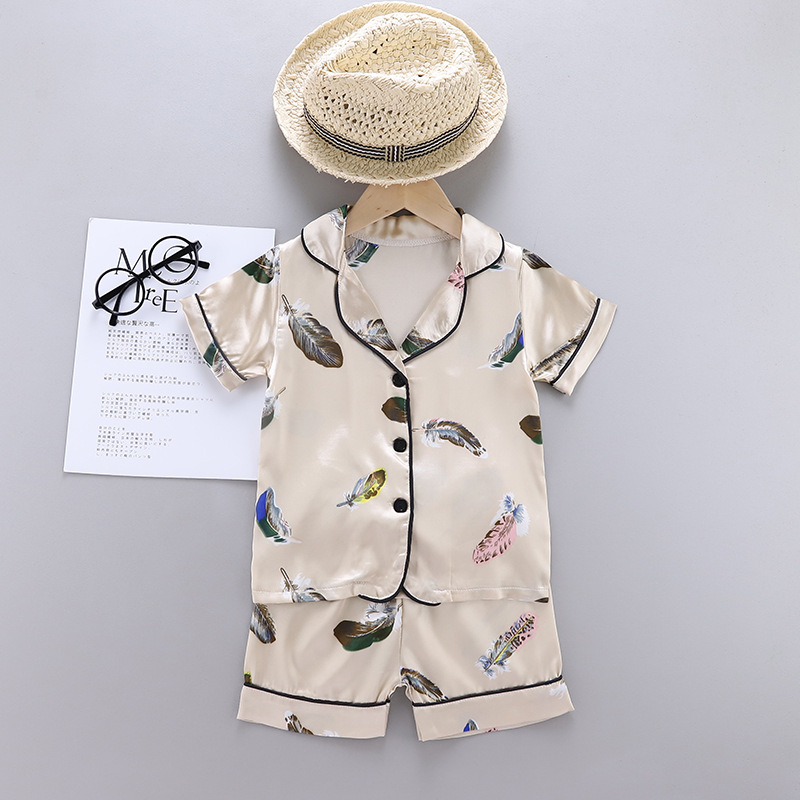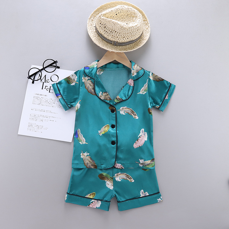 여름 신상 ins 스타일 아동복 남아 여아 만화 깃털 프린트 반팔 아이스 실크 잠옷 세트