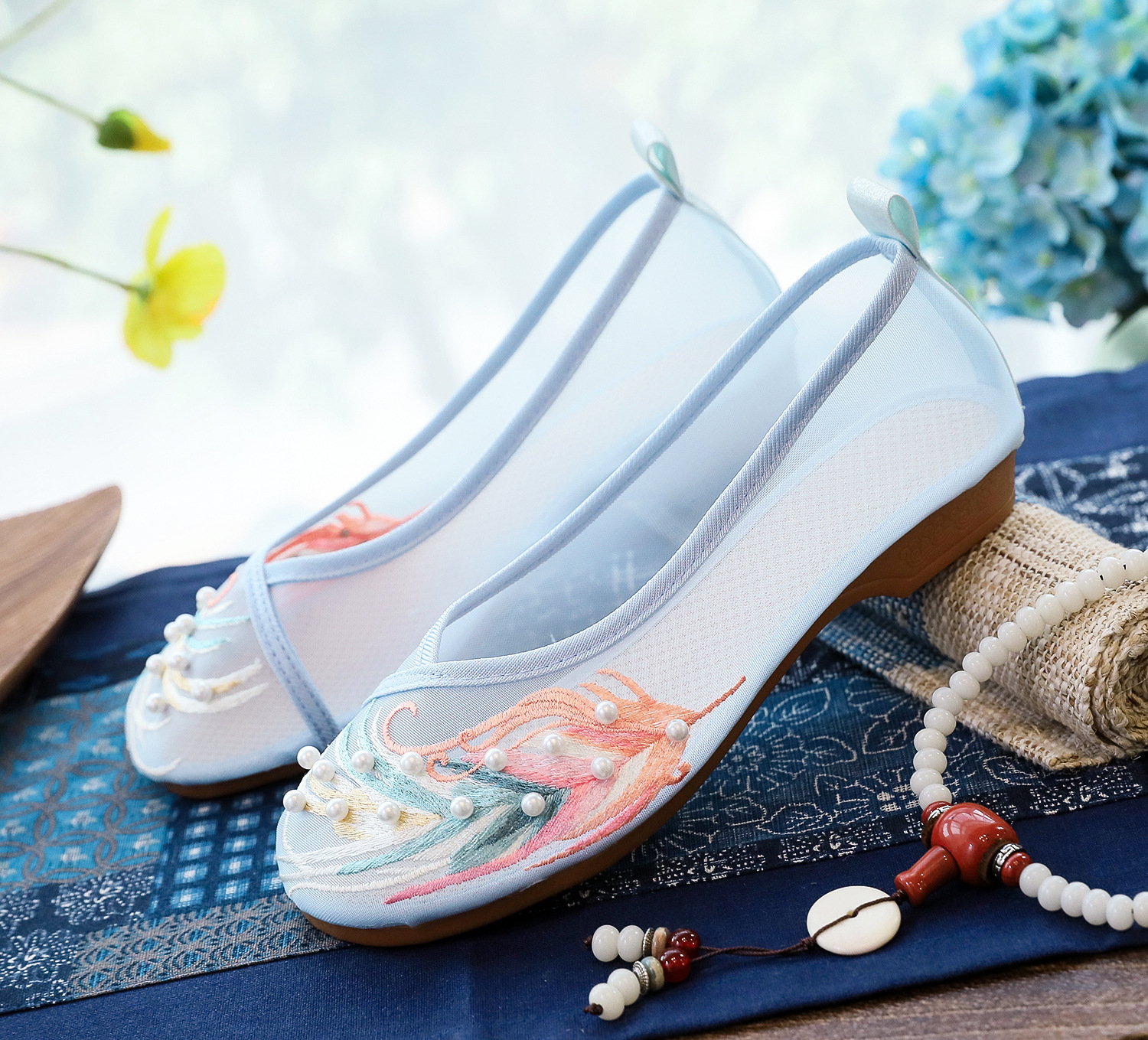 메쉬 신발 골동품 신발 자수 메쉬 신발 라운드 발가락 중공 플랫 자수 신발 샌들