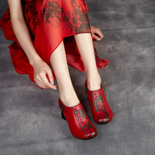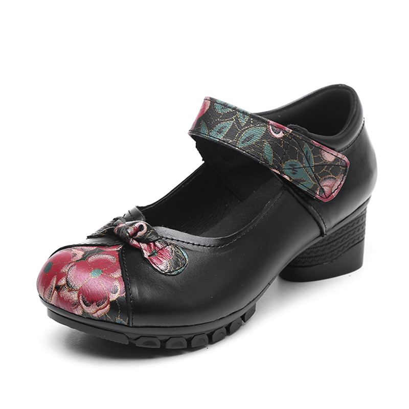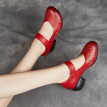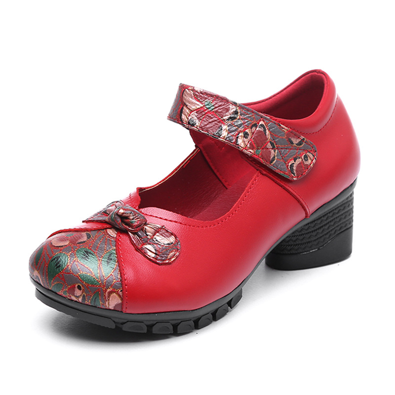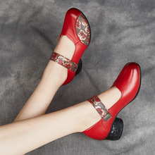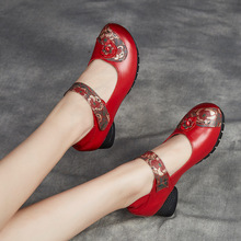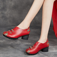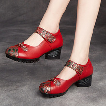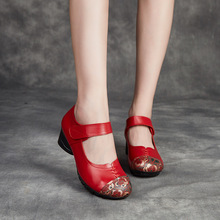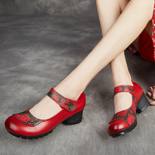 에스닉 바람 봄과 가을 시즌 여성 신발 두꺼운 굽 댄스 슈즈 여성용 얕은 입 탑 레이어 가죽 어머니 소프트 바닥 가죽 신발 도매스토어 가기