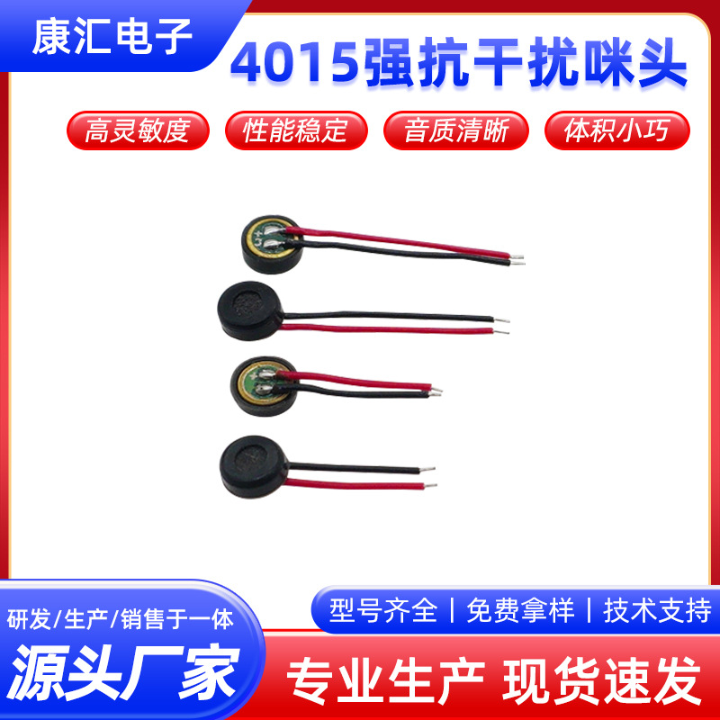 图上产品KH4015L 强抗麦克风。线长根据客户需要,特殊的也可以定制。可广泛用于功能手机、智能机、蓝牙耳机、智能AI机器人、早教机、蓝牙音箱、电话机等