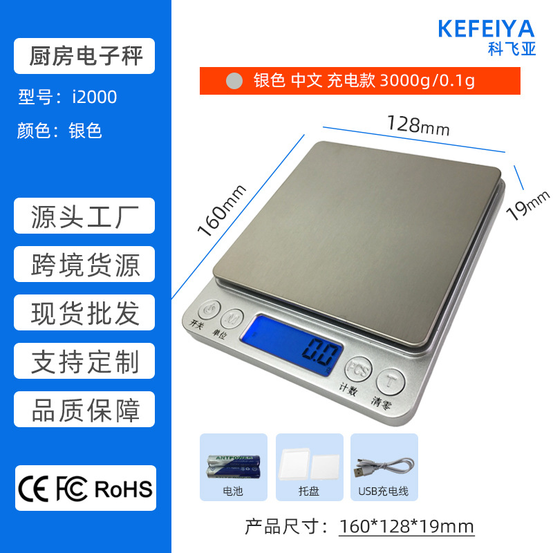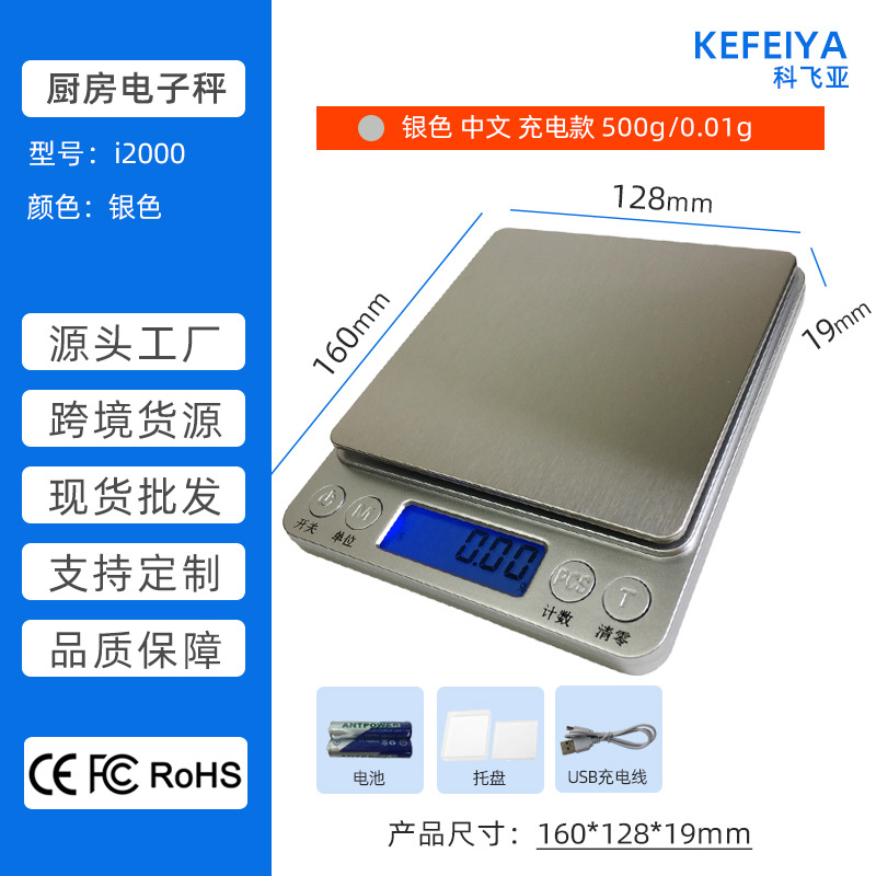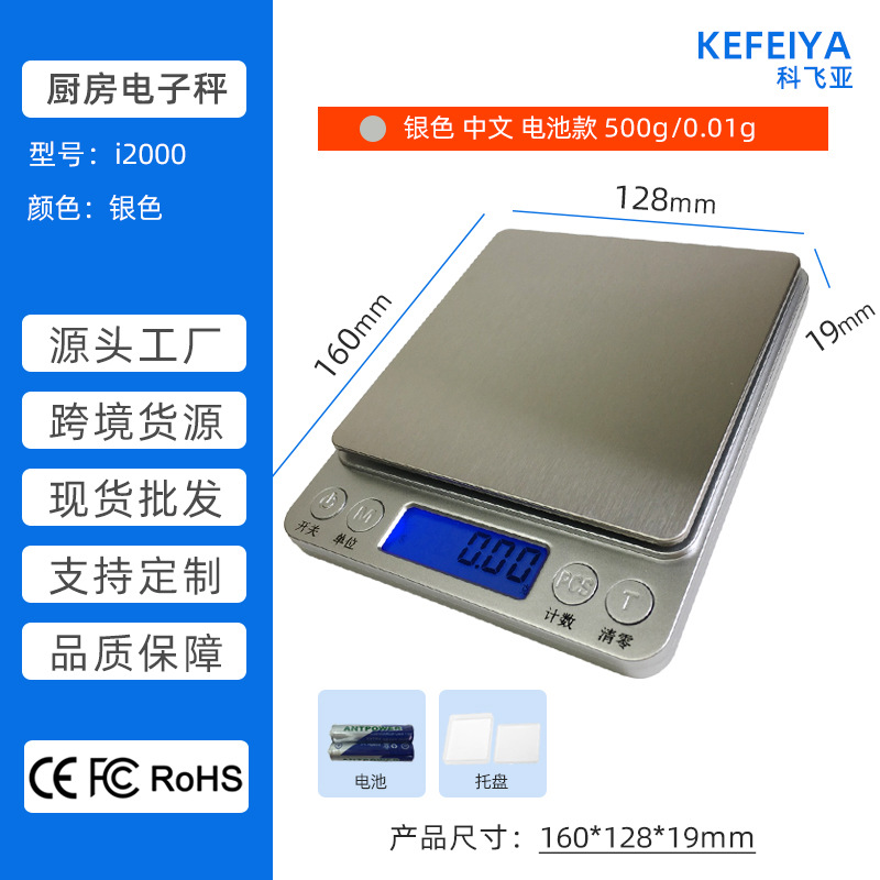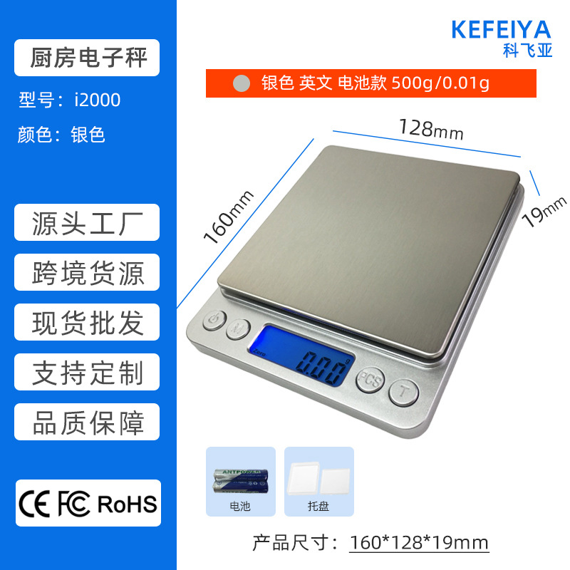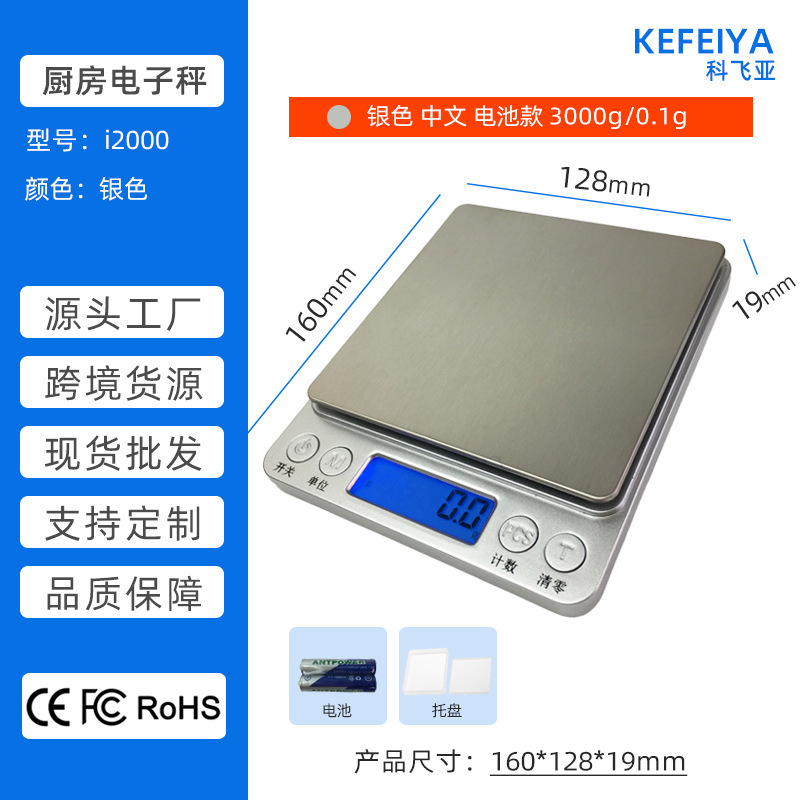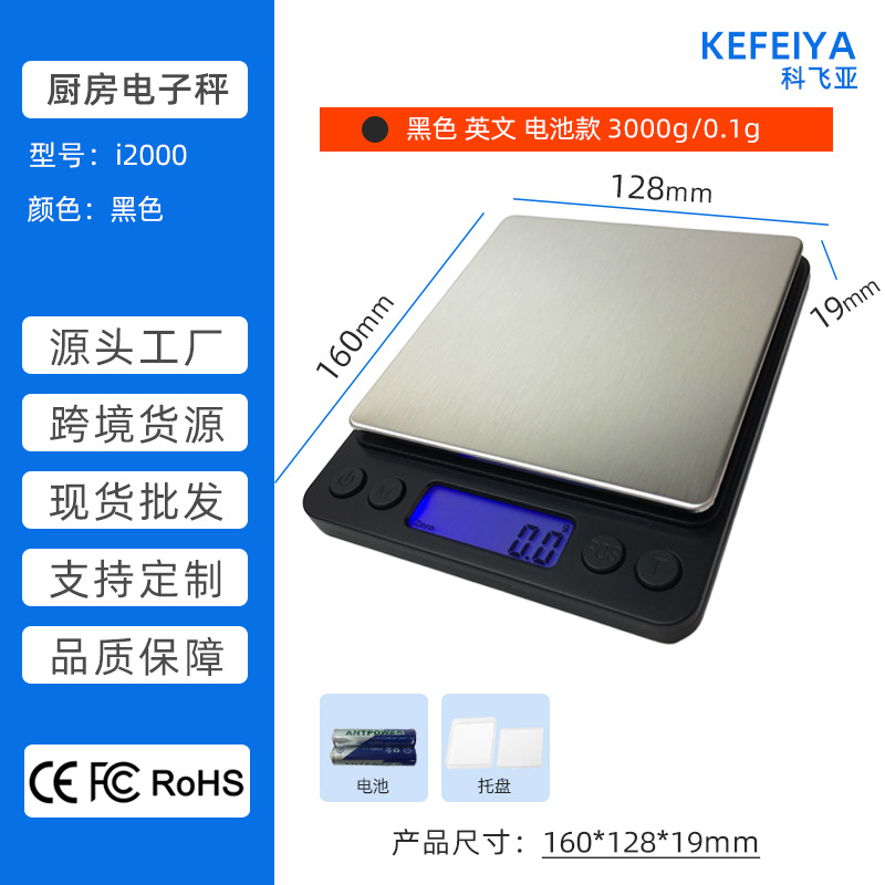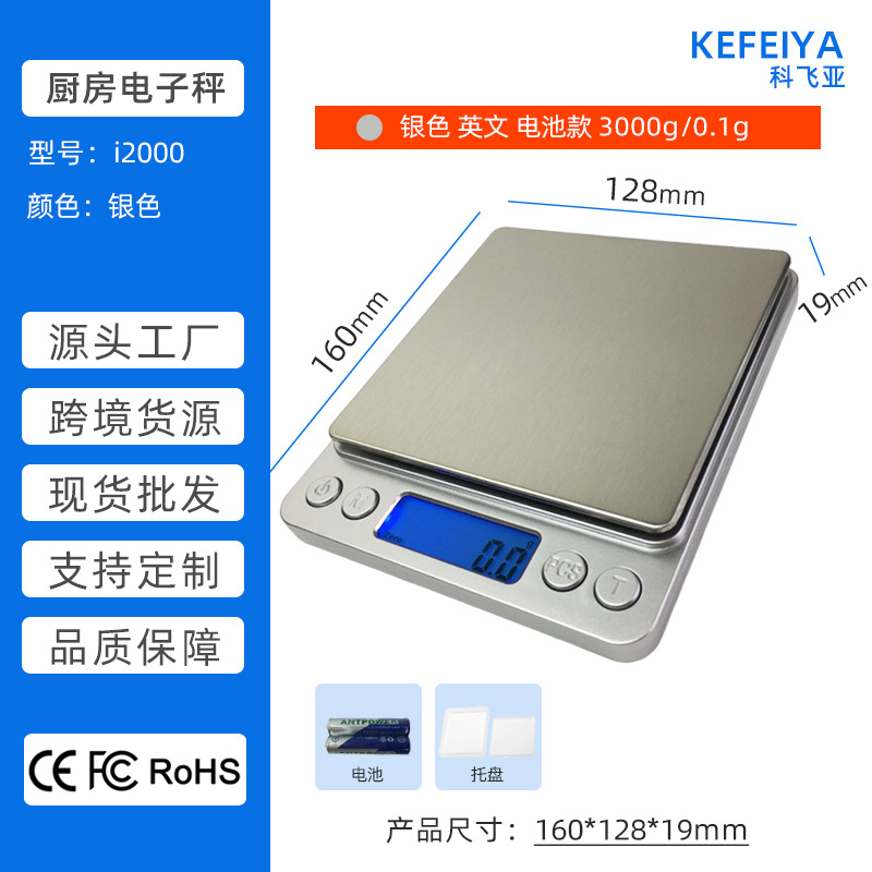 深圳科飞亚电子秤源头工厂-i2000厨房秤生产厂家 小型不锈钢厨房电子秤 家用食品食物蛋糕烘焙称 便携茶叶中药材药粉秤 迷你珠宝黄金首饰秤 带一大一小双托盘 3Kg/0.1g 500g/0.01g 跨境爆款 现货批发 支持OEM加工贴牌定制