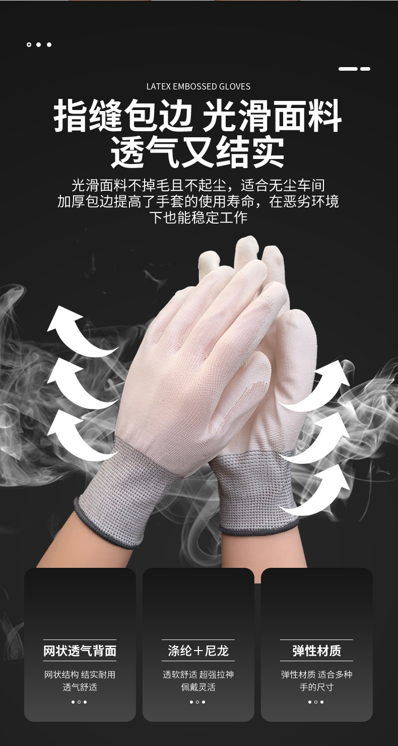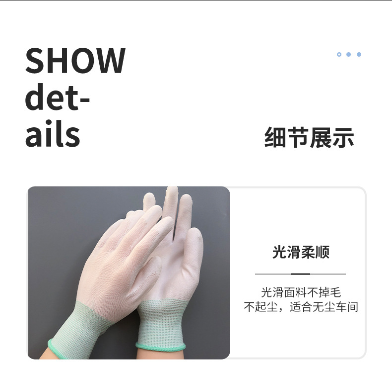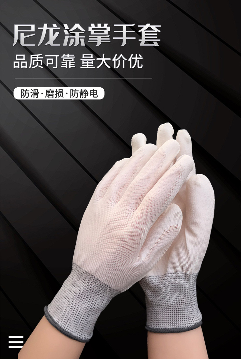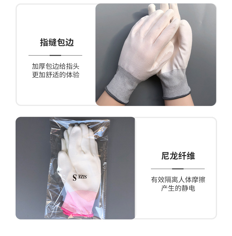 얇은 흰색 나일론 Pu 손바닥 코팅 손가락 장갑 정전기 방지 노동 장갑 내마모성 접착제 미끄럼 방지 작업 도매스토어 가기