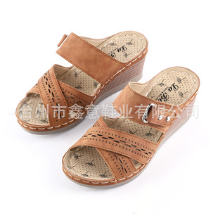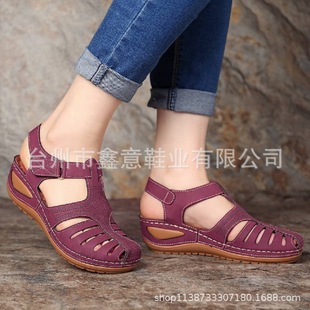 2020wish跨境爆款大码女士凉鞋 包头镂空一字式坡跟罗马风凉鞋女 RMB:25
